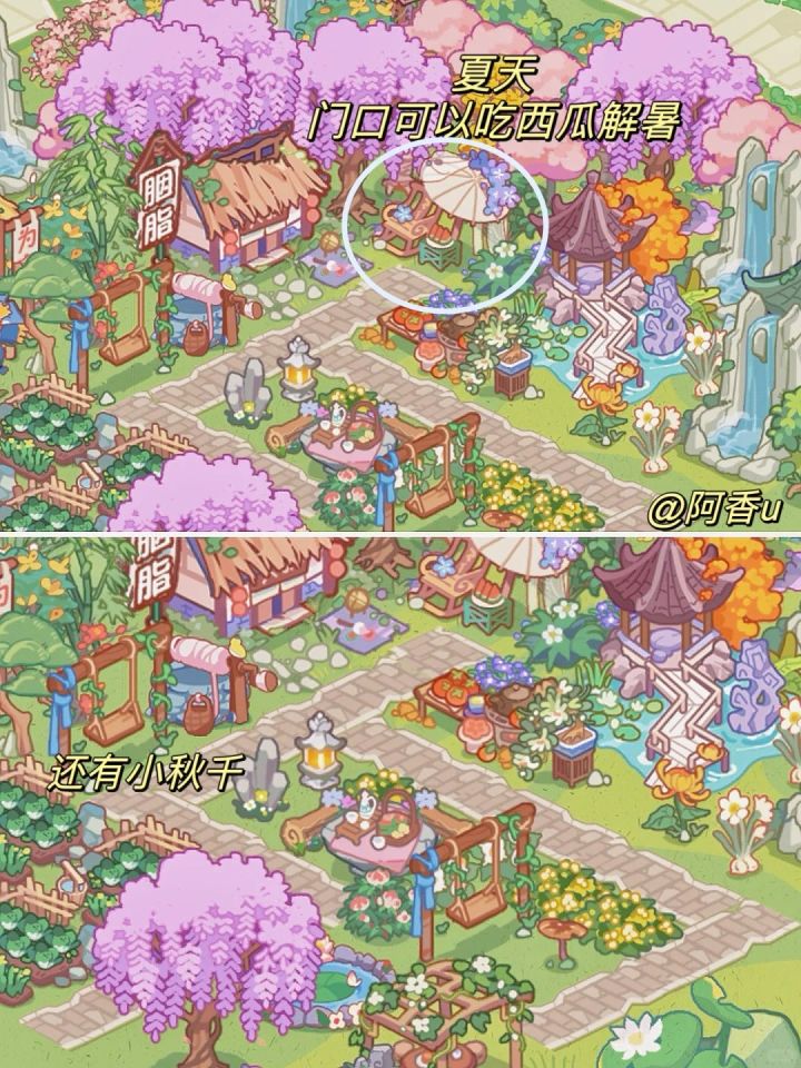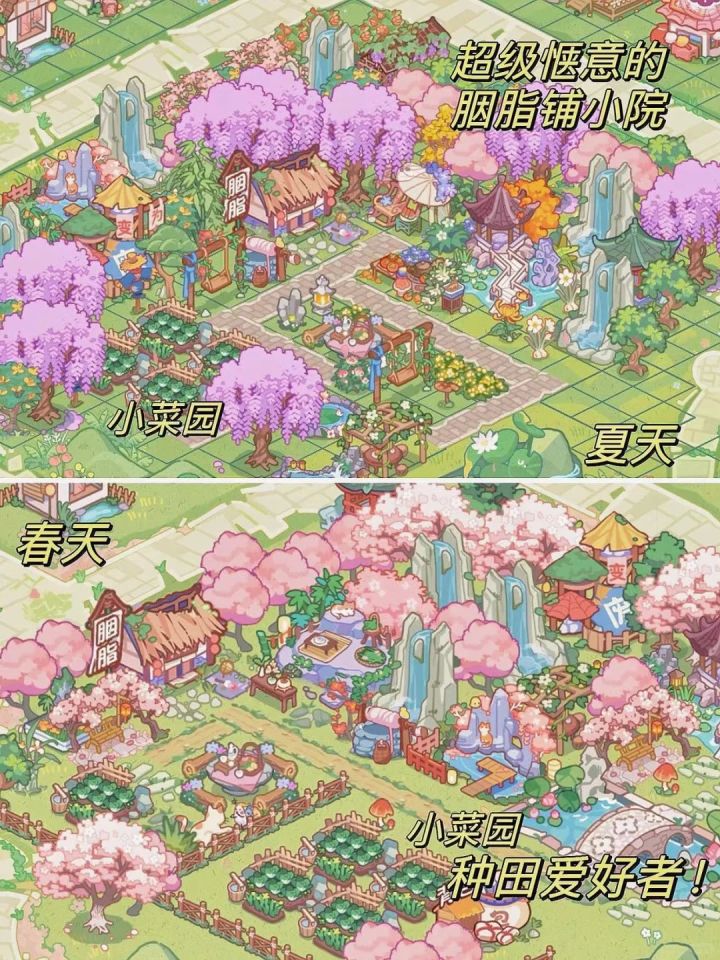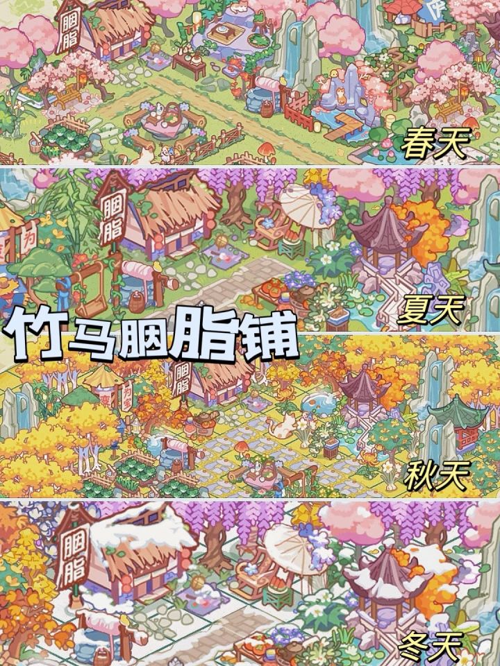 各位亲爱的掌柜,为了给大家持续带来新的装扮思路、分享给更多掌柜看到,我们向优秀的创作者申请了官方号搬运的授权~之后大家点击【装扮竹马】子版块,就能看到我们持续更新,分享给大家的优秀装扮分享啦~今天给大家带来来自小红书博主@阿香u 的装扮分享,以下是她分享内容的配文:竹马胭脂铺的春夏秋冬游戏里拥有四季令就可以转换季节,做了四个季节的胭脂铺小院,每个季节都很爱~转换到冬天时除了土地会变成雪地,