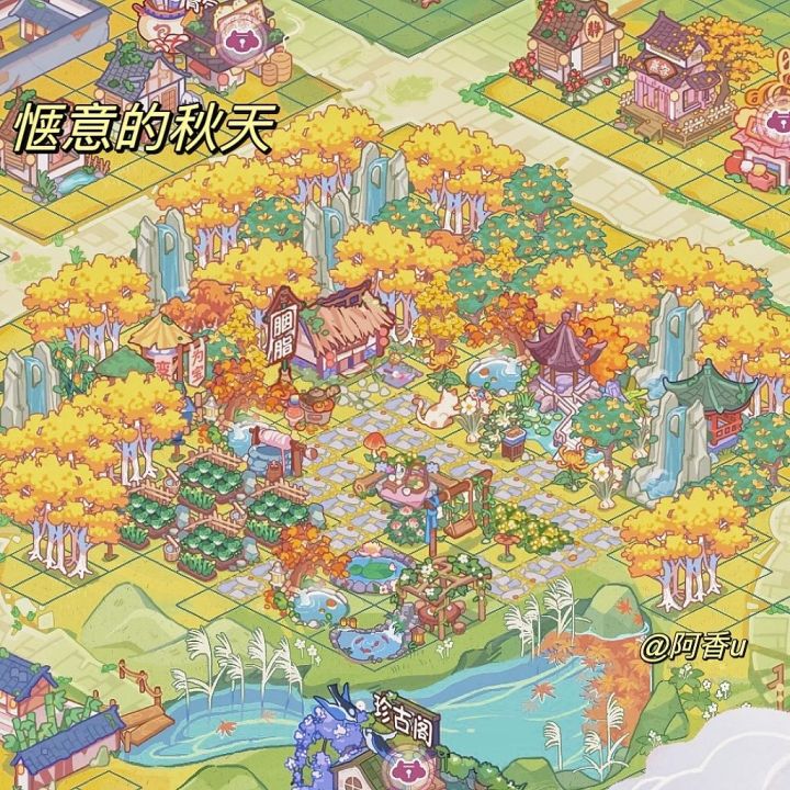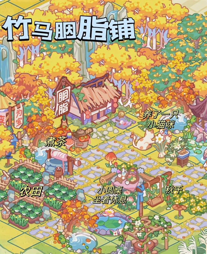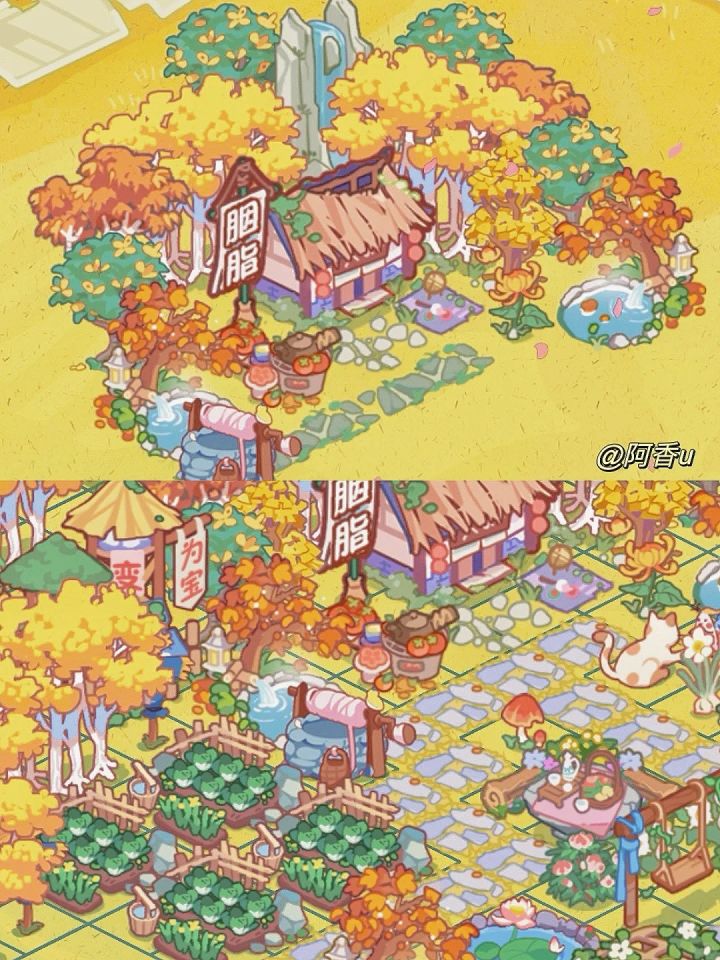 各位亲爱的掌柜,为了给大家持续带来新的装扮思路、分享给更多掌柜看到,我们向优秀的创作者申请了官方号搬运的授权~之后大家点击【装扮竹马】子版块,就能看到我们持续更新,分享给大家的优秀装扮分享啦~今天给大家带来来自小红书博主@阿香u 的装扮分享,以下是她分享内容的配文:好爱这个画风!竹马胭脂铺的秋有新游戏玩咯游戏里超级多家具可以使用!而且都是细节满满!有农田有凉亭,有山有水还有各种树木可以随