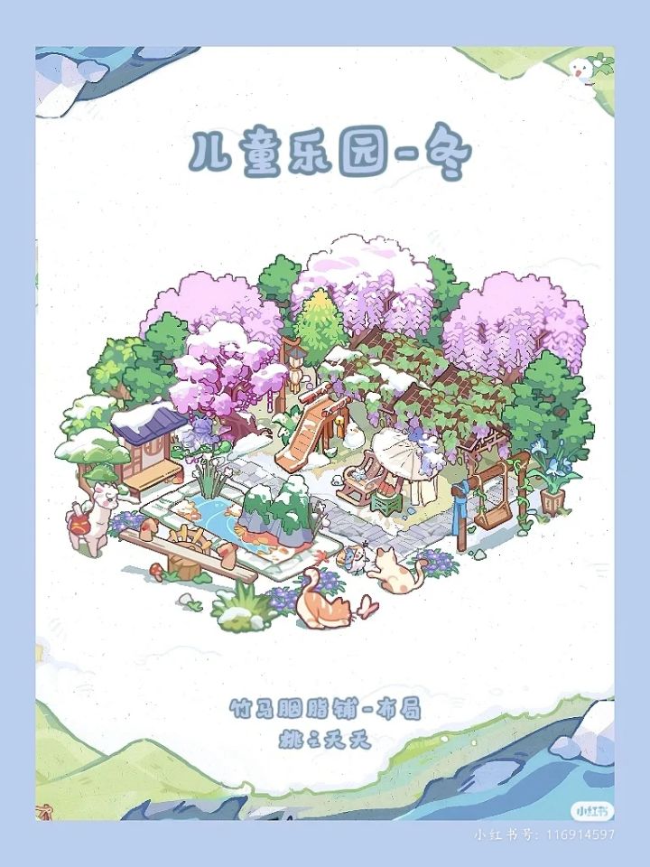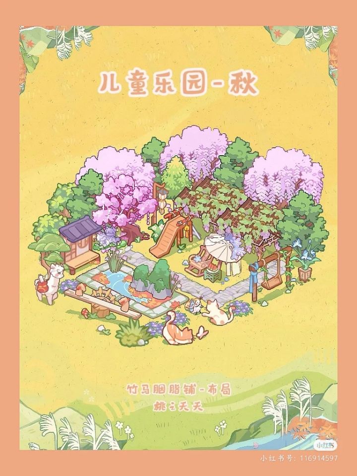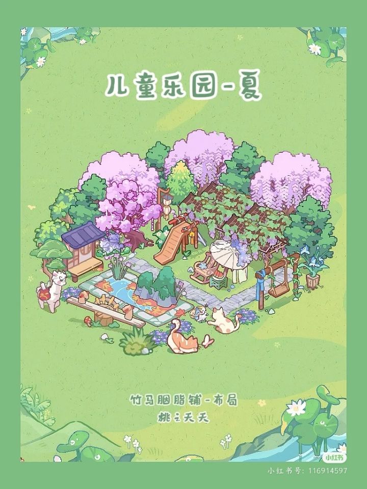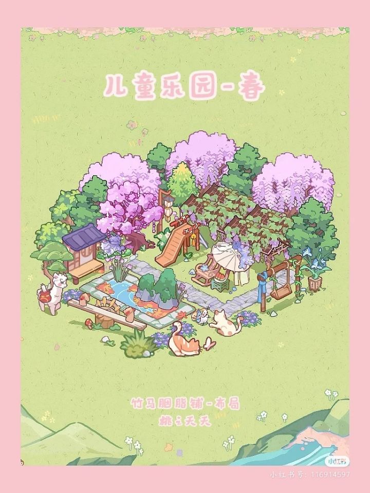 各位亲爱的掌柜,为了给大家持续带来新的装扮思路、分享给更多掌柜看到,我们向优秀的创作者申请了官方号搬运的授权~之后大家点击【装扮竹马】子版块,就能看到我们持续更新,分享给大家的优秀装扮分享啦~今天给大家带来来自小红书博主@桃之夭夭爱桃汁 的装扮分享,以下是她分享内容的配文:🌙我在《竹马胭脂铺》里建了个儿童乐园~‼今天发现《竹马胭脂铺》里居然有秋千、跷跷板和滑梯,那怎么能不摆一个儿童乐园呐~