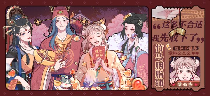 值此新春佳节,竹马县也是一片红红火火热热闹闹的景象,家家门前都贴上了崭新的春联,连万老爷的元宝都擦得更晃眼了些(星星眼)胭脂铺子里宁宁正噼里啪啦打着算盘做年终盘点,小元忙着张罗年夜饭,乌鸦大哥也难得露出了笑脸。看着这一桌好酒好菜,小编的嘴角不禁流下了感动的泪水。在这里小编携竹马小伙伴们,祝各位掌柜的新春开运,宏兔大展,前兔似锦,红包多多~新的一年,我们竹马来相约♥——————————官方