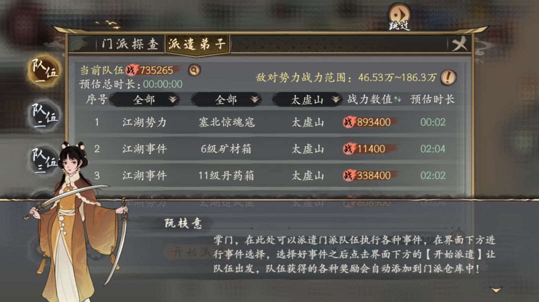 江湖巡游玩法包含门派探查和派遣弟子两个玩法,使用门派探查玩法可以快速查找到门派附近的各种江湖事件,选择其中适合自己兴趣的玩法进行探索;使用派遣弟子玩法可以根据门派的当前需求,安排不同的门派队伍前往执行,门派队伍在获得指令后会自动前往相关的地点处理事件,掌门只需等待一段时间即可,稍后在巡游界面中可以查看不同队伍获得的收益,体验当掌门的乐趣!
