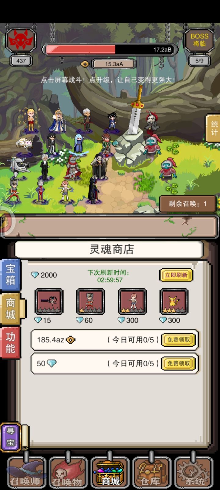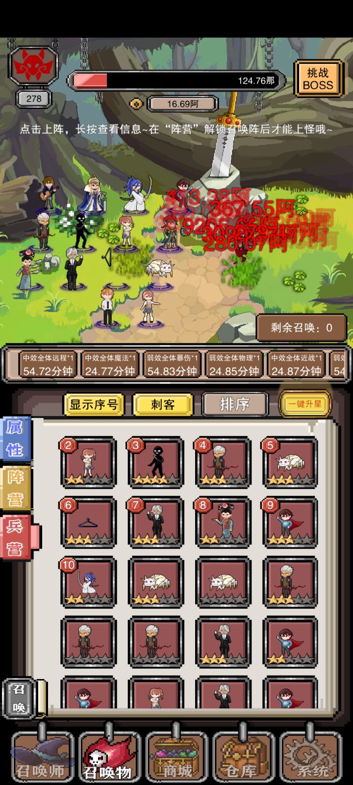 3、当前版本大致攻略: 记得主动卡关攒钱开位置就行,位置提升巨大,用高攻速(圣斗士、奥特曼、黄四郎)角色站伤害最高的位置就行。主动卡关能做到秒怪后无限抽卡,只要是能抽出来的卡都能5星。多转生几次宝物就能挖齐了。