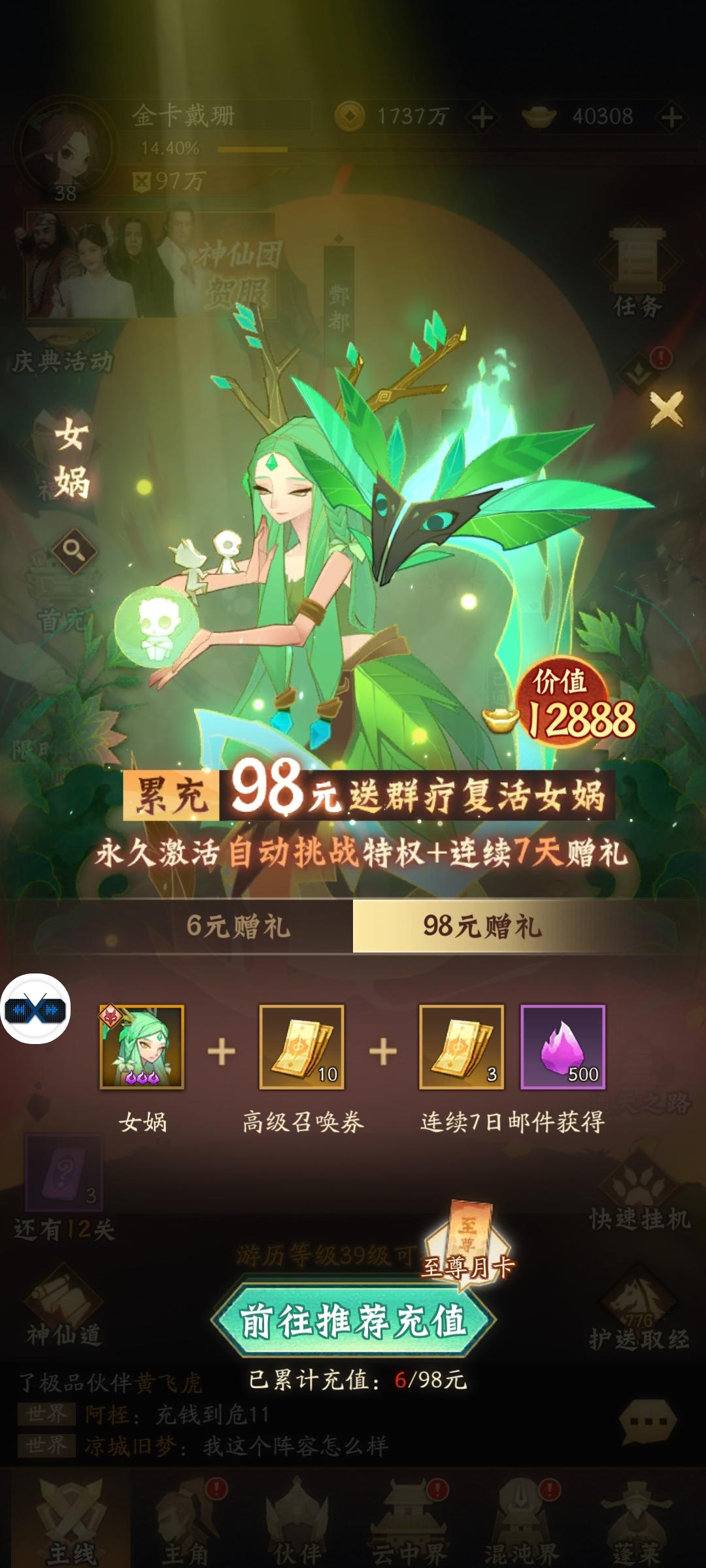 刚进游戏,觉得白毛猛男是最有特色的,果断选择武圣。然后就是一路点点点,差不多一路平推到第五关,开始卡游历等级,这玩意儿只能靠挂机攒修为,点一下快速挂机基本就又能推几张图。今天成果差不多就是这样,卡在第八章半了,呃呃,实在升不动游历等级。今天玩下来就分享下这些干货吧:1、送的斗战胜佛拿来前期打打工得了,也没有感觉特别强,平民就玩极品伙伴,无双伙伴太难升星了,你们可以看看这进阶公式。2、混沌秘