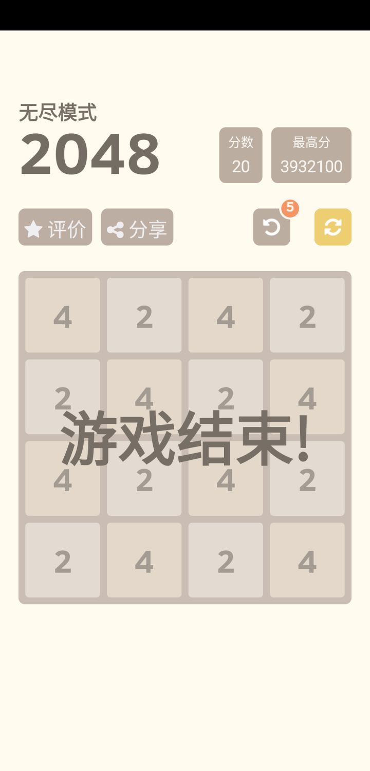 【高分秘诀:将最大数永远放在角落里】如:将最大数放在右下角,那么此时你只能向→和向↓划动,以保证最大块在角落,当然,如果最下面几格满了,那么便可以尝试向←划,最右侧满了,那么便可以尝试向↑划,最大数放其他角落里以此类推就好了,这样,无论是3*3 4*4 5*5 6*6 8*8都特别容易拿到较为可观的分数。【赖皮法】然后就是本版本的赖皮法了,因为这个版本是能“反悔”的,所以便可以疯狂反悔来得到