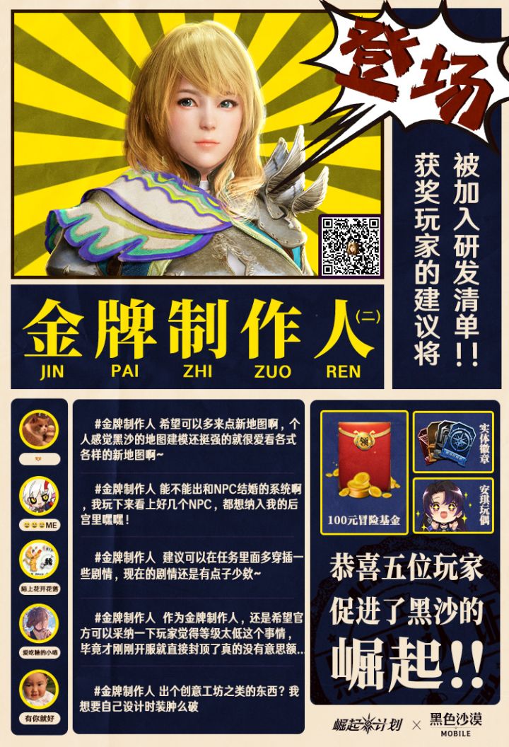 嗨,冒险家们,我是黑沙策划安琪!时间过得真快,此刻已经走到了【崛起计划】第3期招募活动的名单公布环节!此前两次活动,安琪已经收集到不少切中要害的反馈。珠玉在前,各位金牌制作人还是实力非凡,几波大浪淘沙之后,我们依旧收获了令人眼前一亮的制作建议!现在,经过投票与评选,【崛起计划】金牌制作人第3期游戏建议征集活动的获奖名单正式出炉!究竟都有谁,在大浪之后沉淀出金子般光亮的制作建议呢?一起看看!这