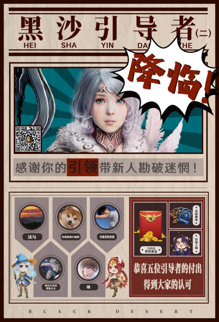 嗨,冒险家们,我是黑沙策划安琪!在3期【崛起计划】系列活动之中,黑沙引导者的招募是安琪最为关注的部分,因为这个职业意味着对社区的无私奉献,是社区薪火的象征!但是在看到大家的参与热情之后,又莫名觉得无比放心!现在,【崛起计划】黑沙引导者第期招募活动获奖名单也已经出炉!一起看看光荣的他们都是谁!这5位冒险家将获得如下活动礼包:1.实体勋章2.100元京东卡3.策划安琪玩偶周边感谢他们对社区