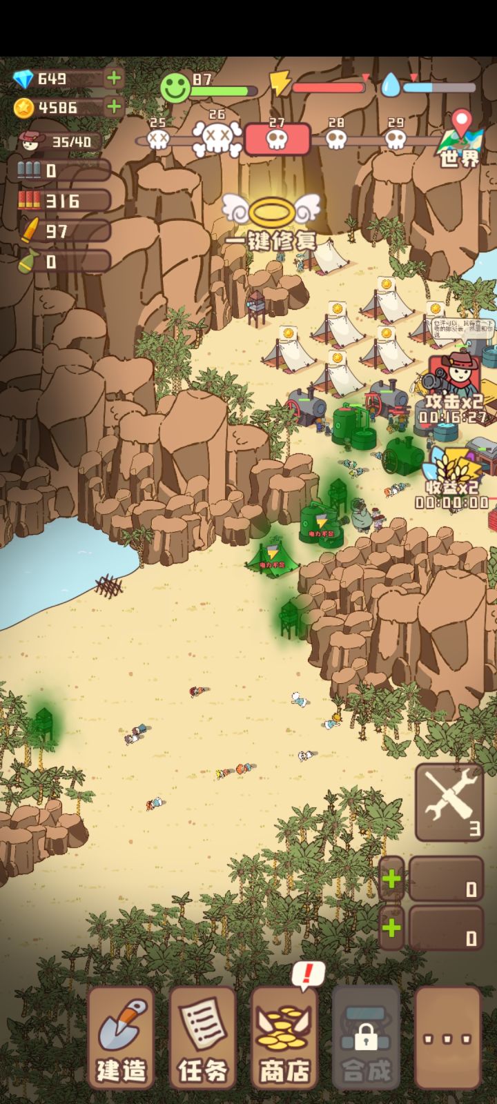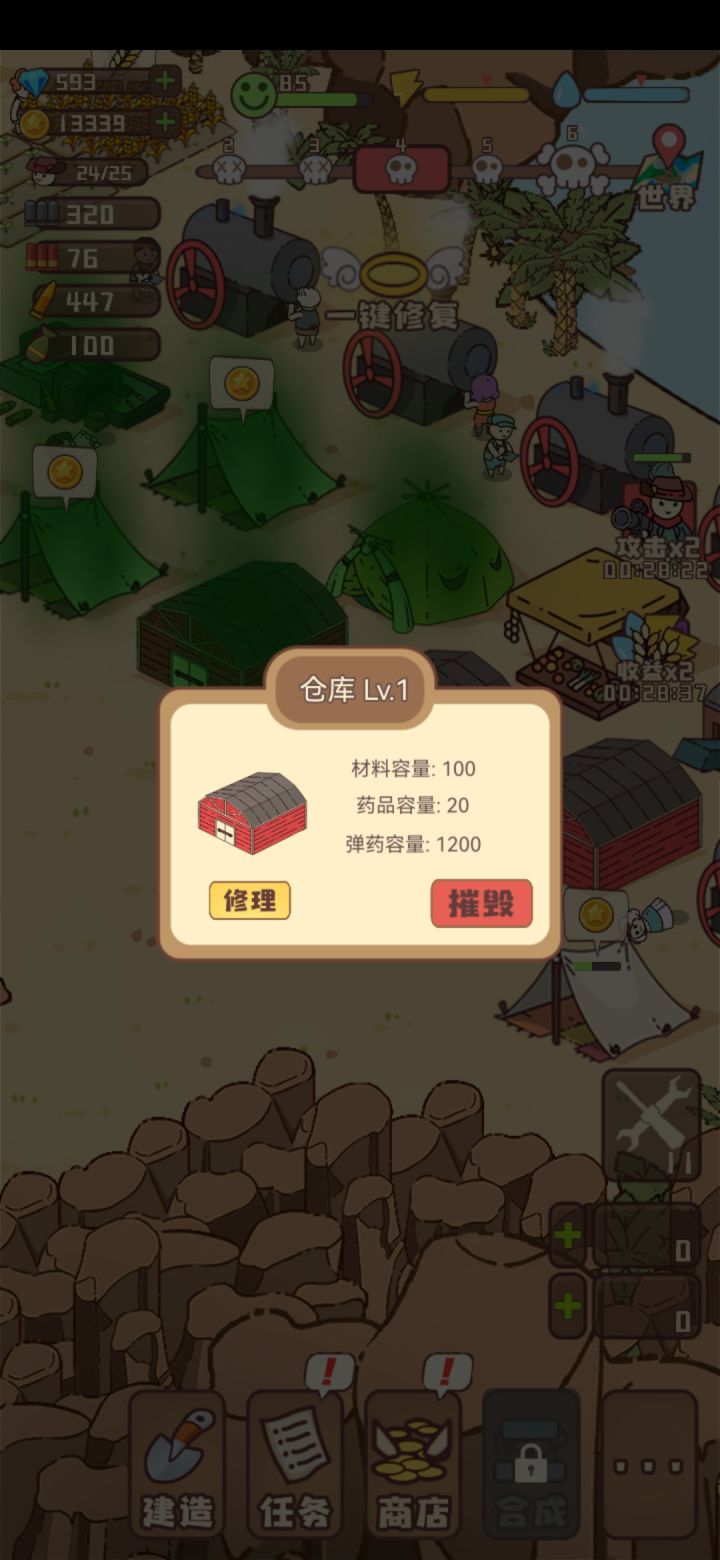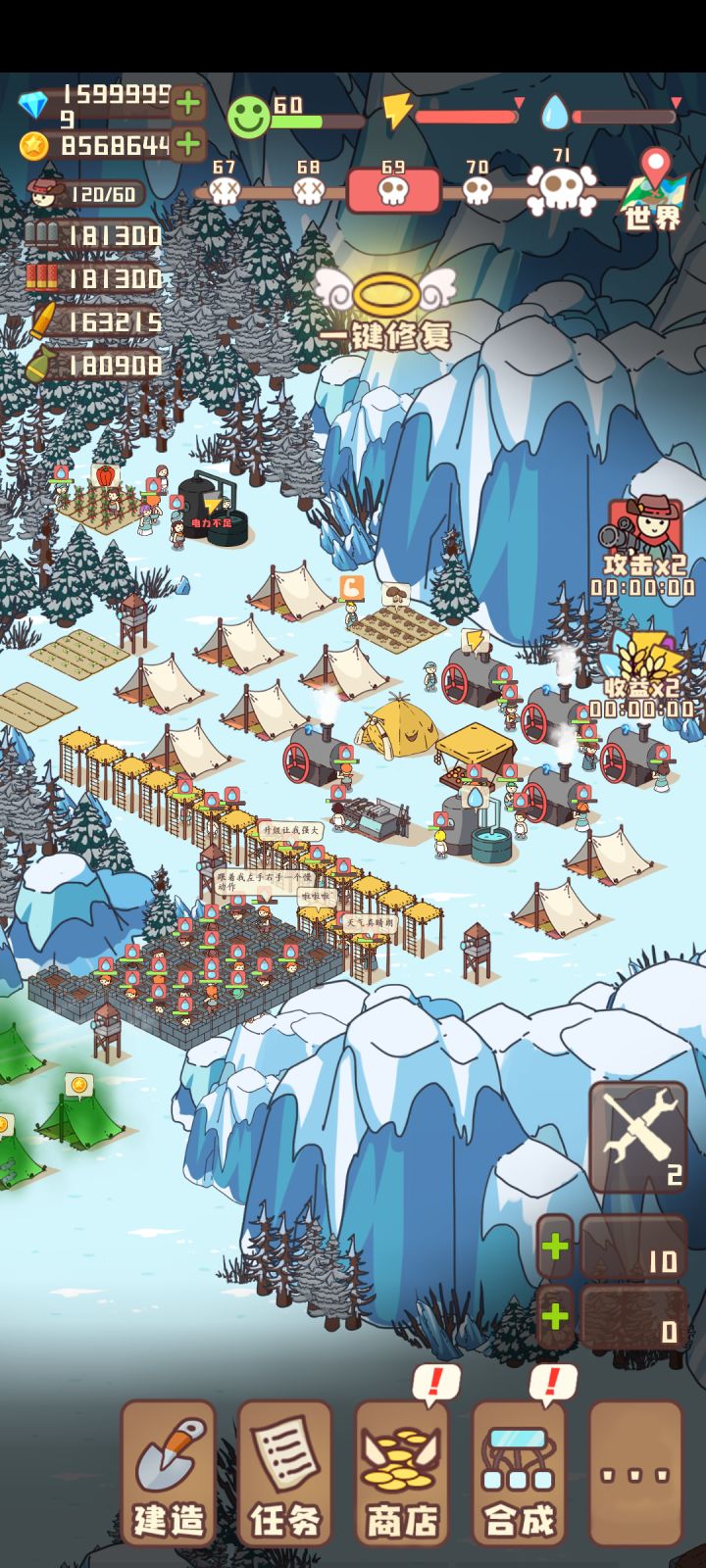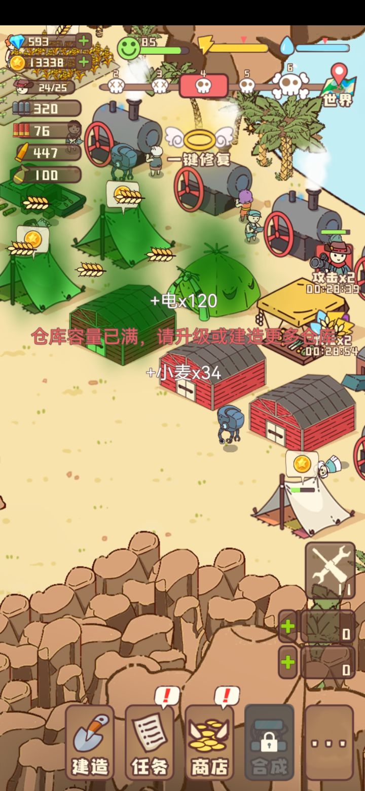 游戏没法玩!本来就是个好游戏老是不更新漏洞!居民人人带几百粮食不自动吃饿死几个意思?改了不可以带粮食还好?还有线下300多粮食就会导致不能造粮了加上其它材料也是多了不能收了本来就电力不足造那么多电厂还限制上线还得造几个仓库几个意思?不可以改下低级高级建筑可以升级低中高?问题一堆不改看了100个广告都没办法后面直接丢炸弹没了!尤其是明明有塔还是直接打人射程也是问题人家打你你打不了别人不能升级防御塔?