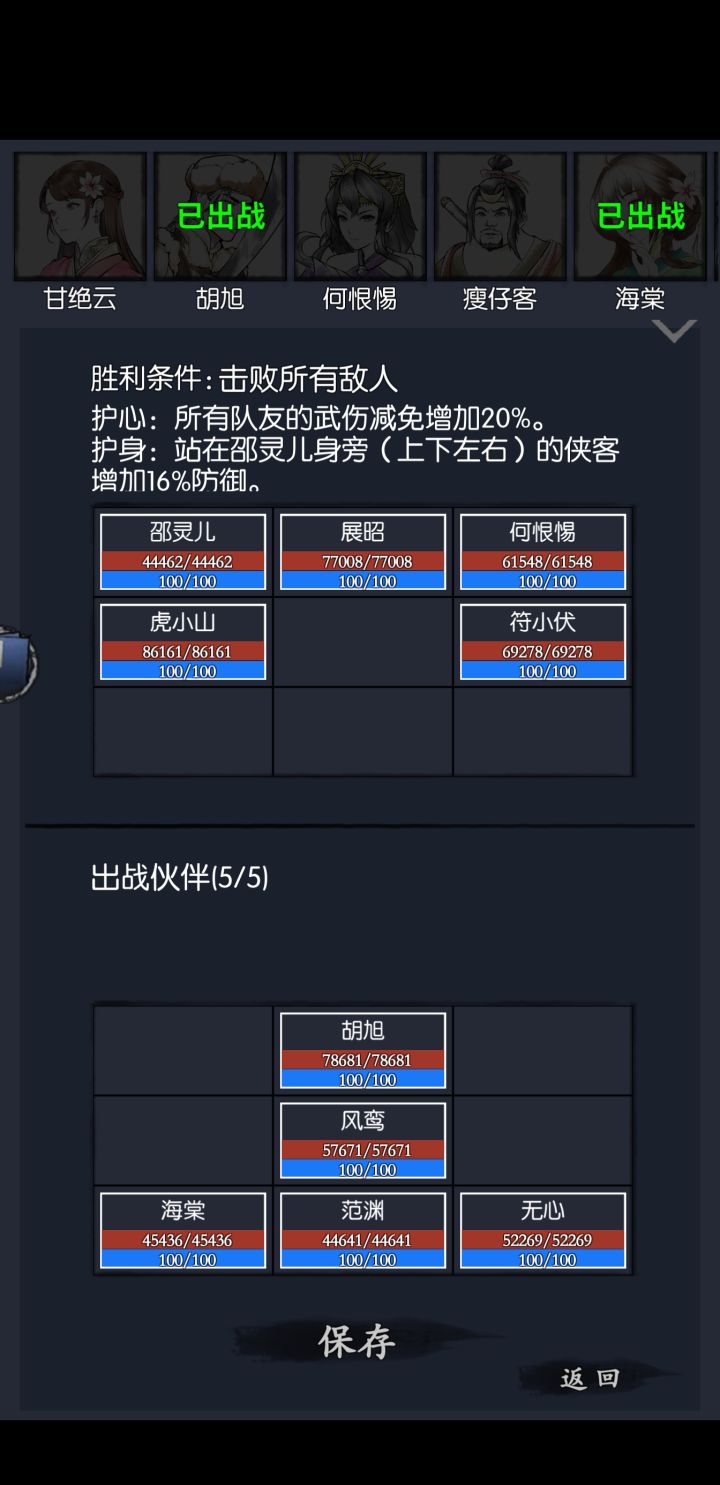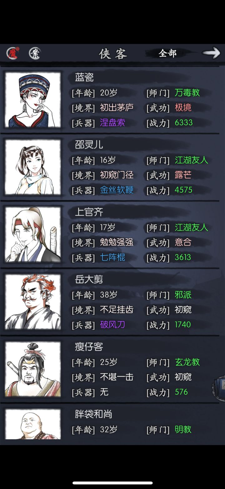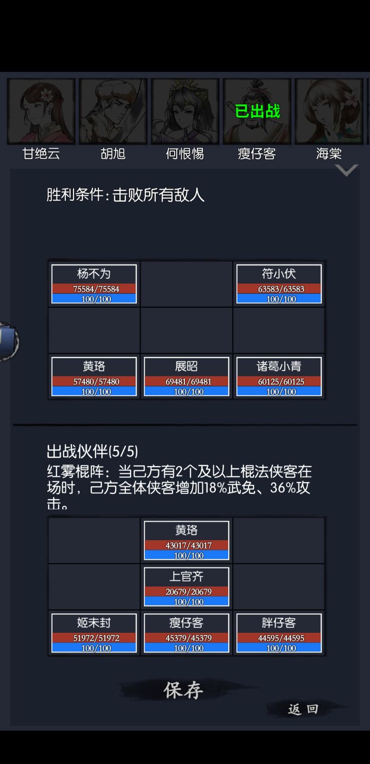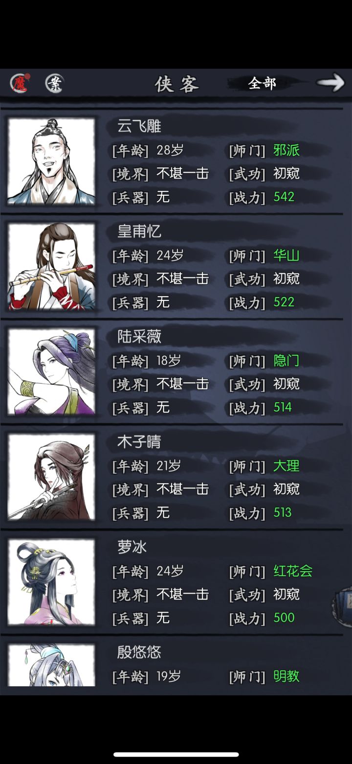 不知道各位都是怎么过的,我目前三队。1.姬未封棍队,强度没得说随便过2.任楚楚何恨惕爆发队 现在发现输出已经很乏力了,只要打不死对面,就会被对面乱拳打死(八宝棍主扛得住,后排侠客扛不住)3.debuff范渊队,胜率50%吧,范渊可能扛不住有没有大佬指明方向,推荐我再养什么侠客,或者说提升现有侠客属性?或者其他的........?P4是我侠客列表