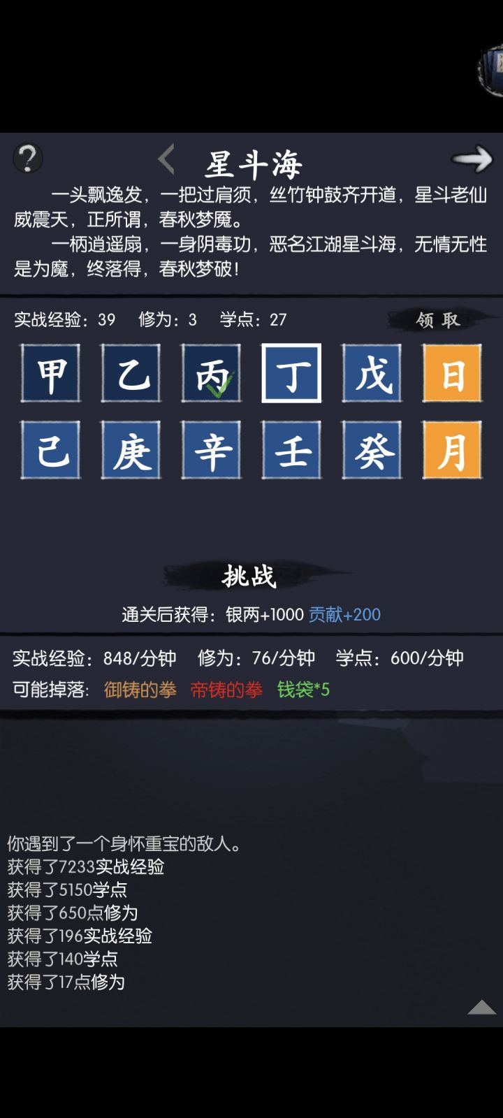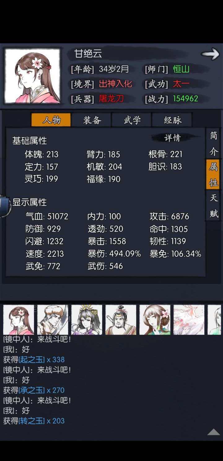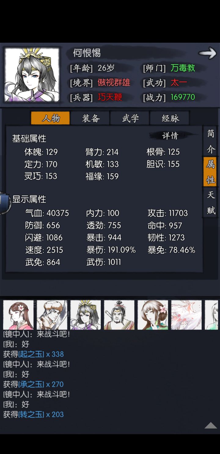 1.上6个侠客穿爆免装我认为>450就行了,第6个侠客磨完之后他会只剩下1%的蓝 2.雁无伤控血,要求打完后对方剩下56752×0.44=24970.88血量+一次公孙武学伤害的血量(具体多少我这边也算不出来),24970是触发归元回血44%的血量 3.用公孙慢慢打死 我这边失败了可能是公孙练度低,可能是装备没配好,我累死了我调不动了,但我一定是有能打通的潜力的。 但太浪费时间了 或者我在想,竟然