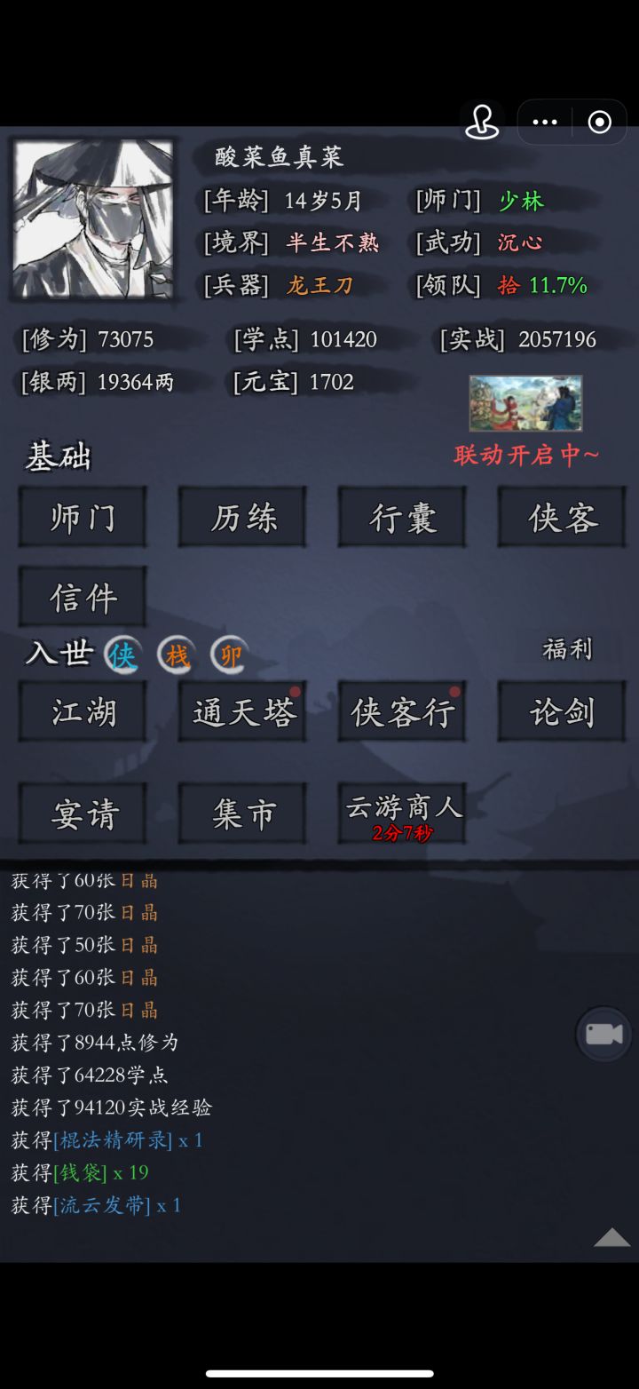 。其实也就历练最后一关通关 承天井月+通天塔85 86通关。 其他也没啥提升,该打不过还是打不过。 继续长草两个月等姬复刻吧,不然我觉得应该也不会有什么实质性的提升了(下个阶段的目标干些啥呢? 开更多侠客5脉?还是啥? 还是养成3个棍为姬小满队伍做准备吗