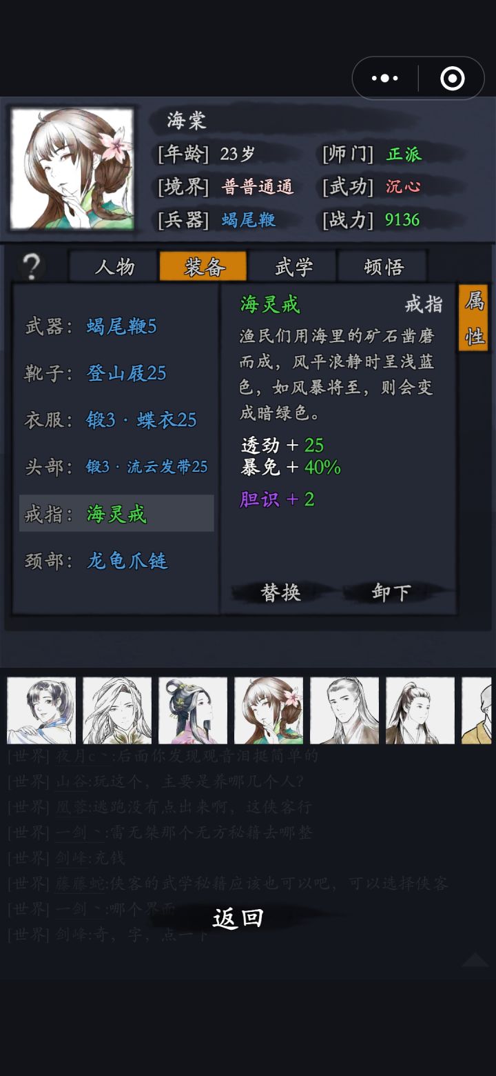 如上图,玩的是零氪书香女丐,侠客有林 杨 海棠 仪瑶 罗冰 胡小山,谛燎 大剪 陆 uu这些都没练。林的2—1开了9级,其它没信物了,因此杨也是没技能的。现在矛盾点:雁哨坞全员反伤,海棠鞭一下被反五下,等嘲讽结束对面集体放技能了除了猴棍主就全死。罗冰第二回合上buff的话全员沉默,海棠又奶不了了,白被反击死,不上罗冰的话小林子装备已经拉满了(如图,攻略说这样能用到挂红?),一剑就算暴击也才不到5