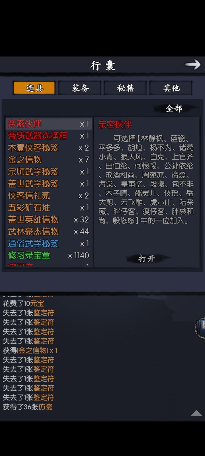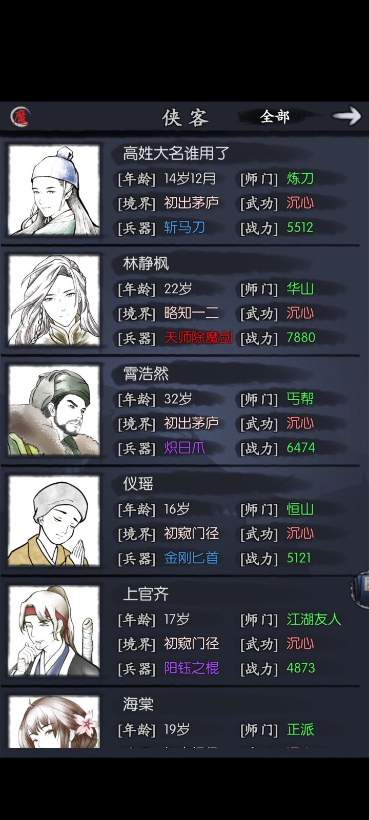 本人萌新零氪预计未来也是零氪,求助一个能长期使用的阵容推荐,目前阵容好像没肉,把霄浩然当半肉玩的,林静枫主c,主角女炼刀门,副c,仪瑶和海棠辅助,不知道亲密伙伴该选什么侠客,武器箱也不知道该优先输出使用还是肉用#你的江湖 #萌新求助 #求助大佬 #零氪
