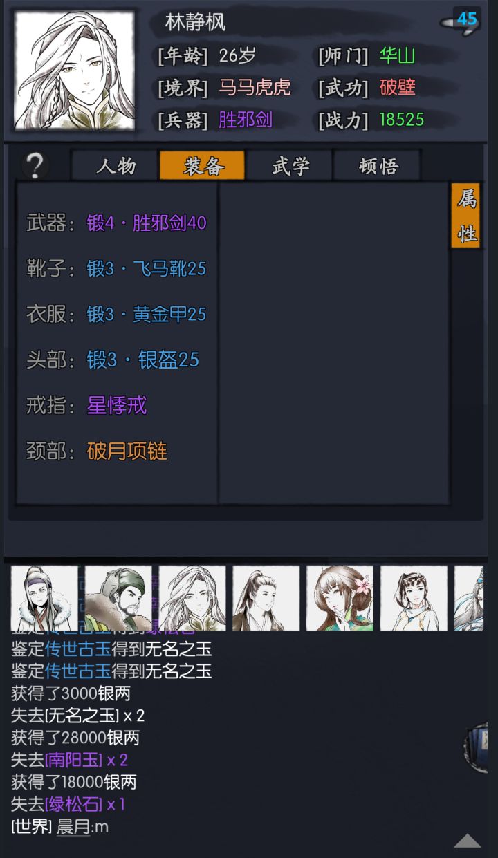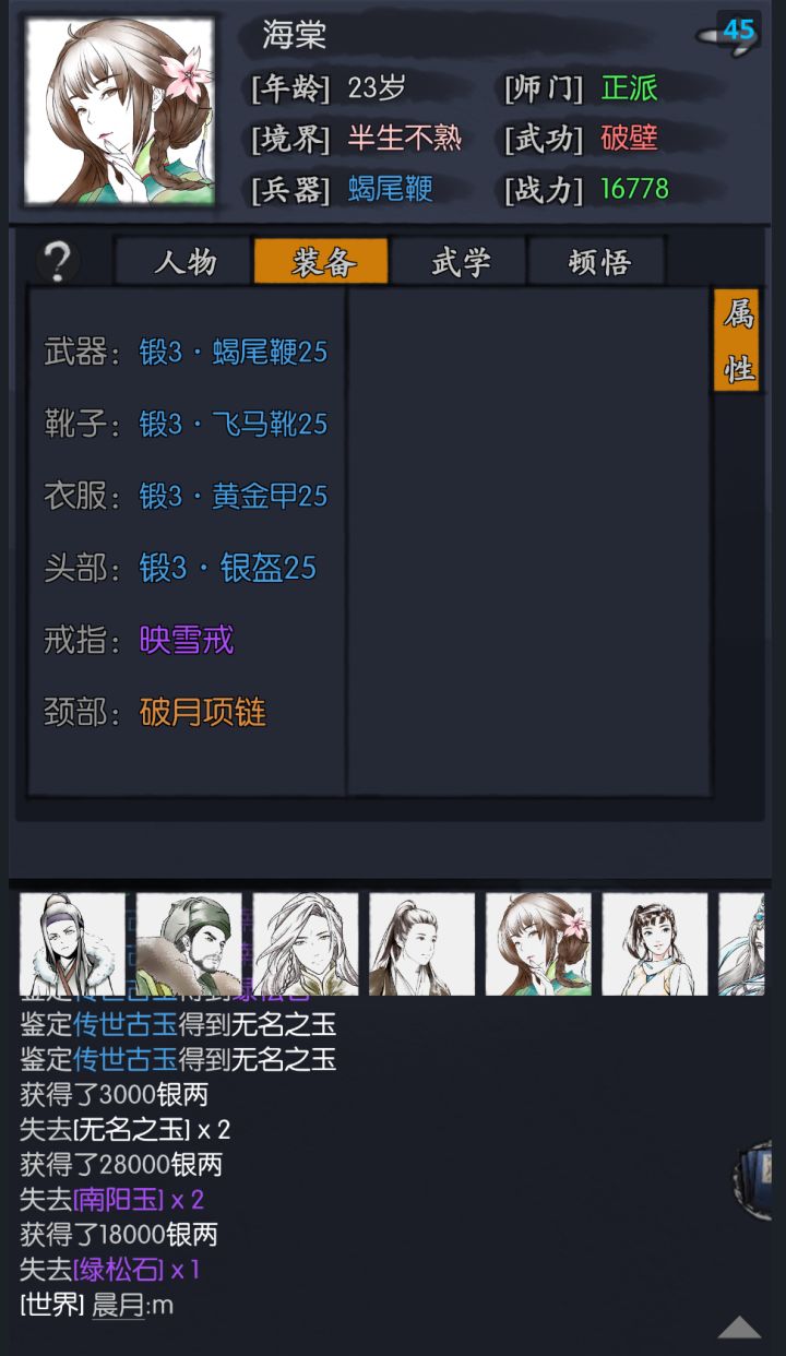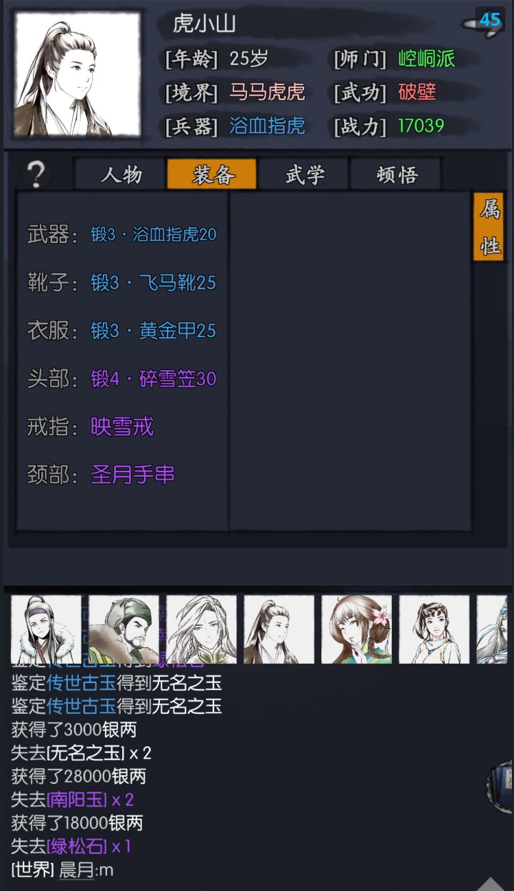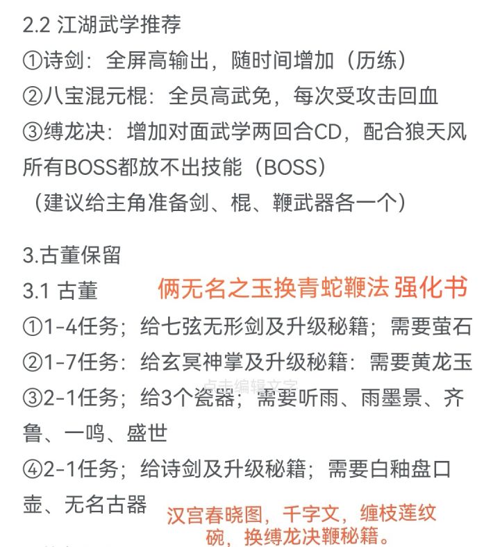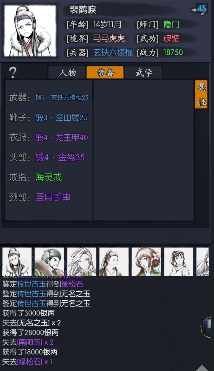 开局选择男角色,天赋推荐武学世家(相比其他天赋推图过历练优势极大),需要多开号刷侠客对话师傅选择刀棍武学,点满刀类武学,装上新手教程里的朴刀历练推到第五关(少林刀推到第五关很容易),解锁江湖。第二关的免费装备选戒指(暴击对于前期过关很有用),等25点臂力(靠装备词条)解锁箱子拿秘籍。第三关难度稍大如果装备词条太差可能卡关等领三即可不影响。将武学再次拉满通过合理利用刀棍武学到第历练十一关。领二