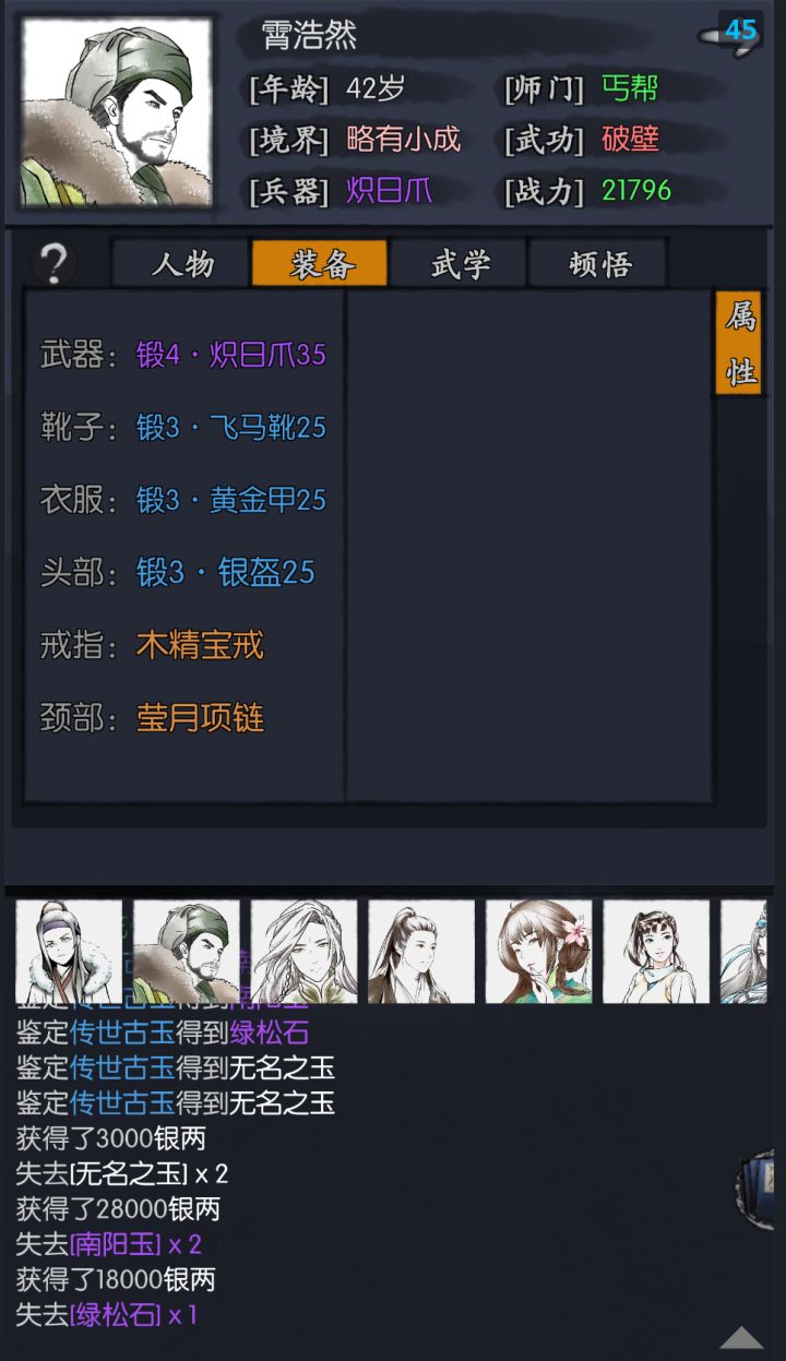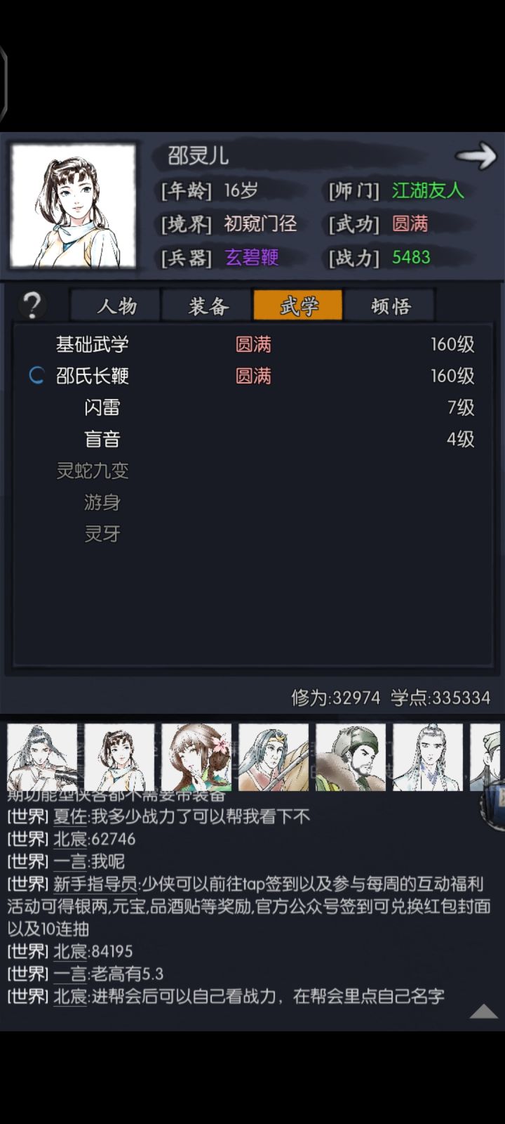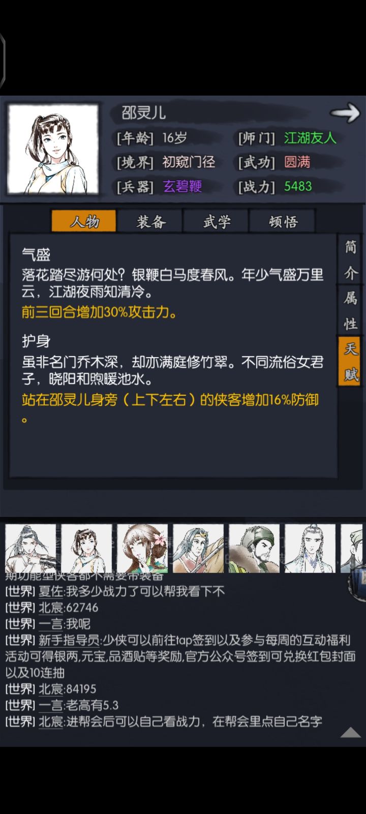 ★灵儿★第一个陪伴主角的侠客 很多攻略都说他很弱 不值得培养 其实不然 就看他的被动 前三回合那伤害是毁天灭地的 一切的恐惧来源于火力不足 他的普通攻击 是全屏的伤害 可以说是火力最猛的侠客 没有之一 【 没有什么是一鞭子解决不了的 如果有那最多再来两鞭子 👽👽👽】 主角出身选 猎户之子 保证先发制敌 拿鞭子拜隐门 这样就有两个 炮台输出再加上上官旗的前排扛伤害 前期丝滑无比 你会发现所有的关卡最