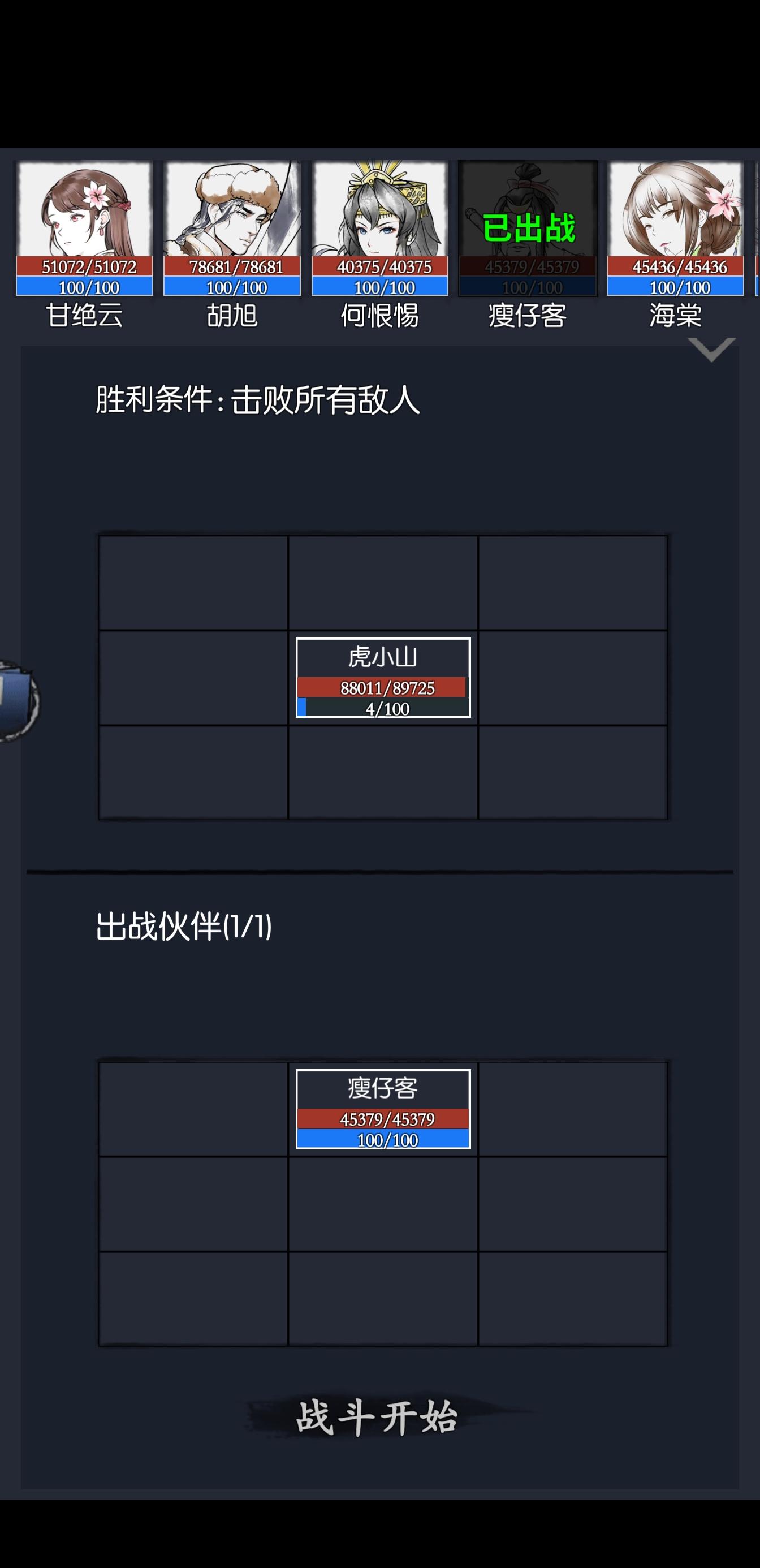 先上6个侠客扛1回合,第二回合让虎小山放武学打死后面上500%爆免瘦仔客慢慢磨,注意18回合左右虎小山回放第二个武学,此时一定要让瘦仔客连着打出沉默熬过20回合,不然扛不住第二个武学然后再上个侠客耗一下虎小山的蓝,然后继续瘦仔客打