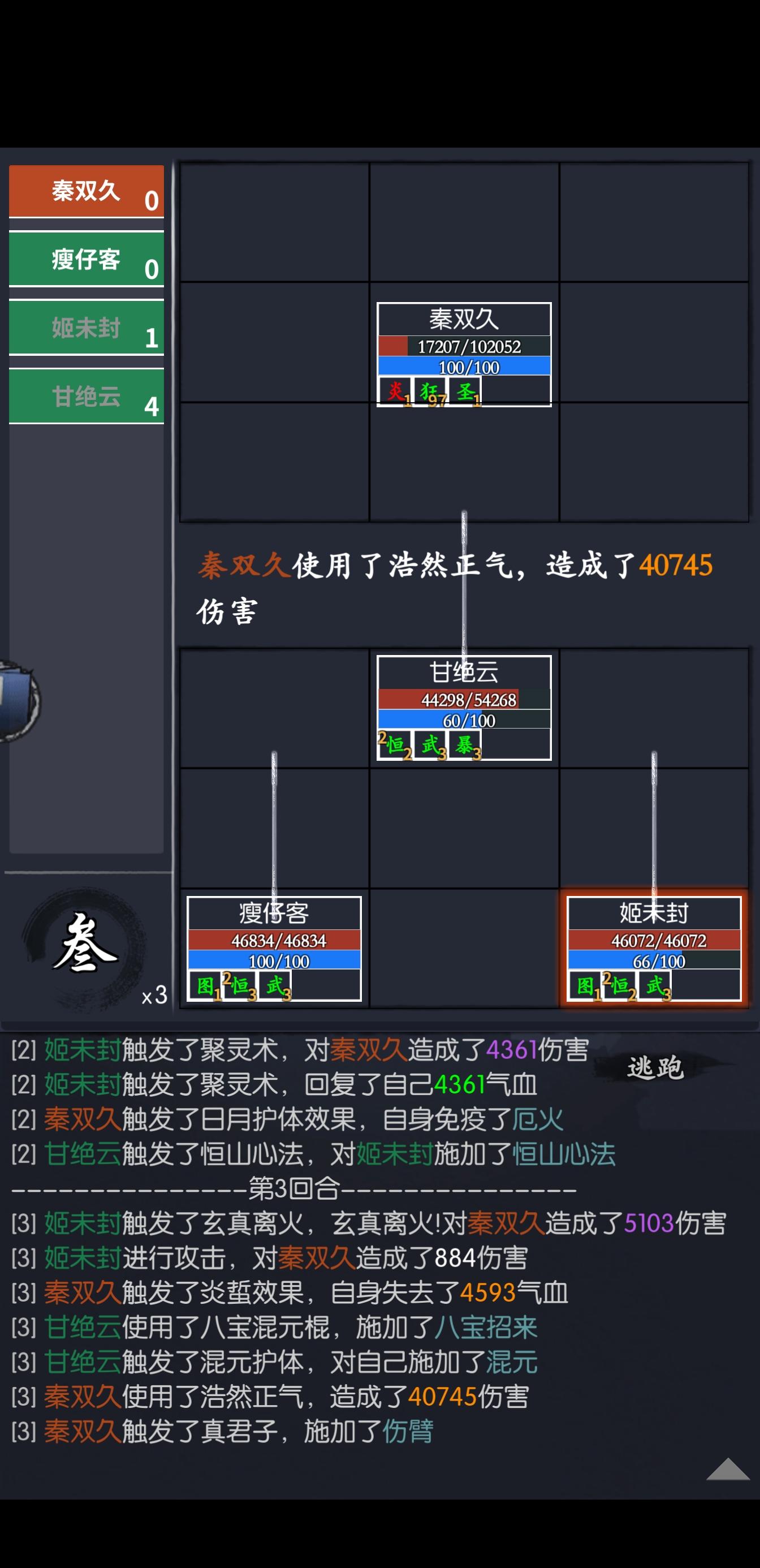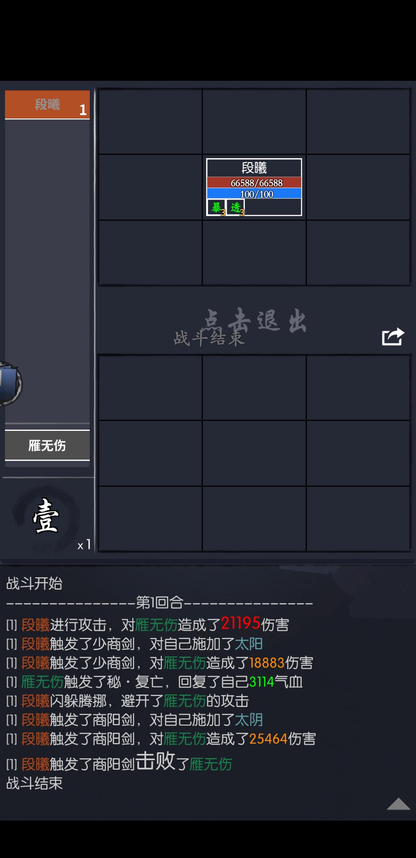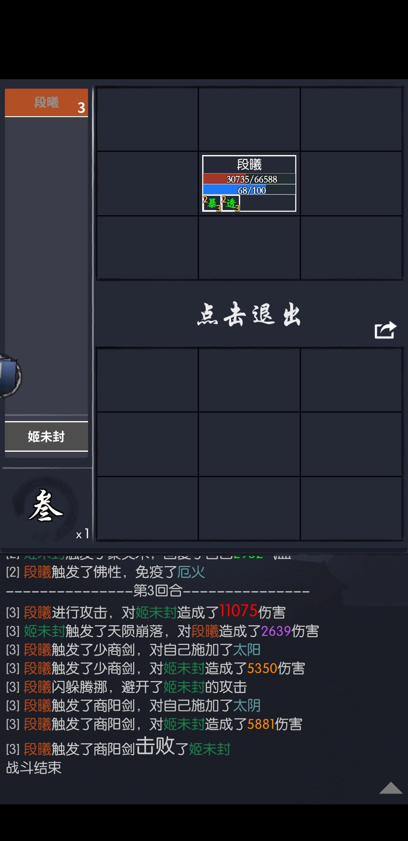 。主要是我的燕无伤一回合就被秒了,然后就来不及点逃跑了,所以我用其他侠试了试。 姬未封的反伤太顶了,能磨掉一半血,剩下 瘦仔客 胡旭 收尾即可。。所以可以是其他五关都打完之后,最后再打这一关,或者说雁无伤我再研究研究怎么配装吧哎。段曦伤害太高了