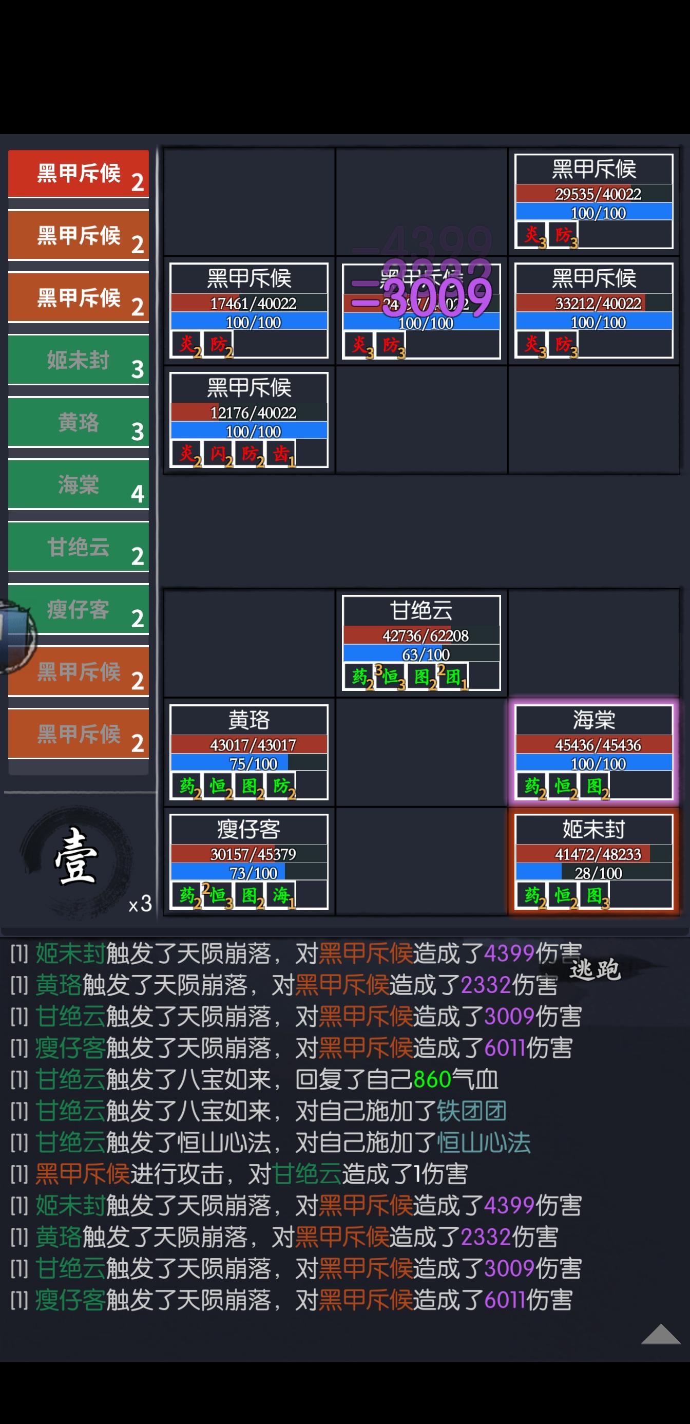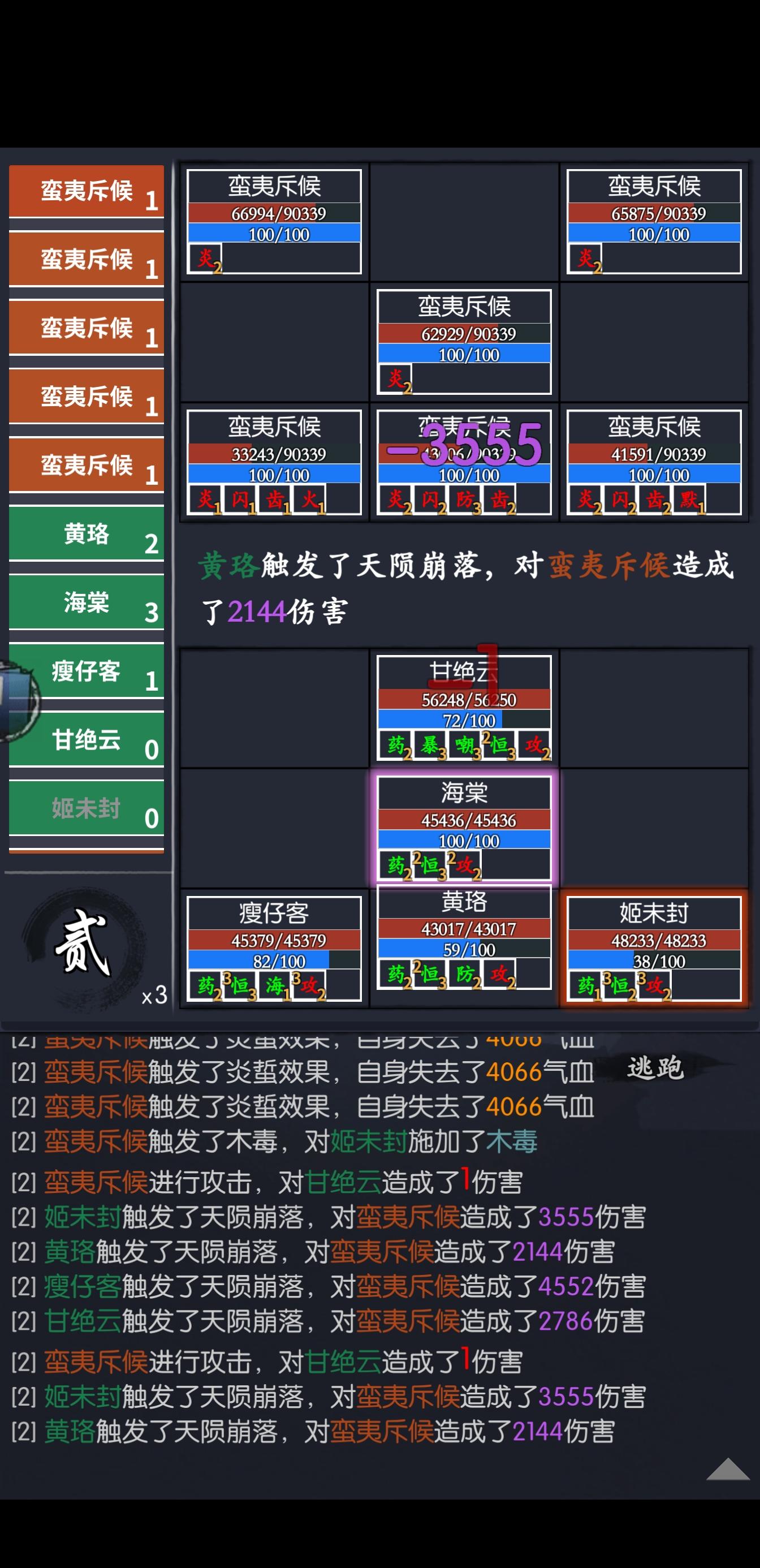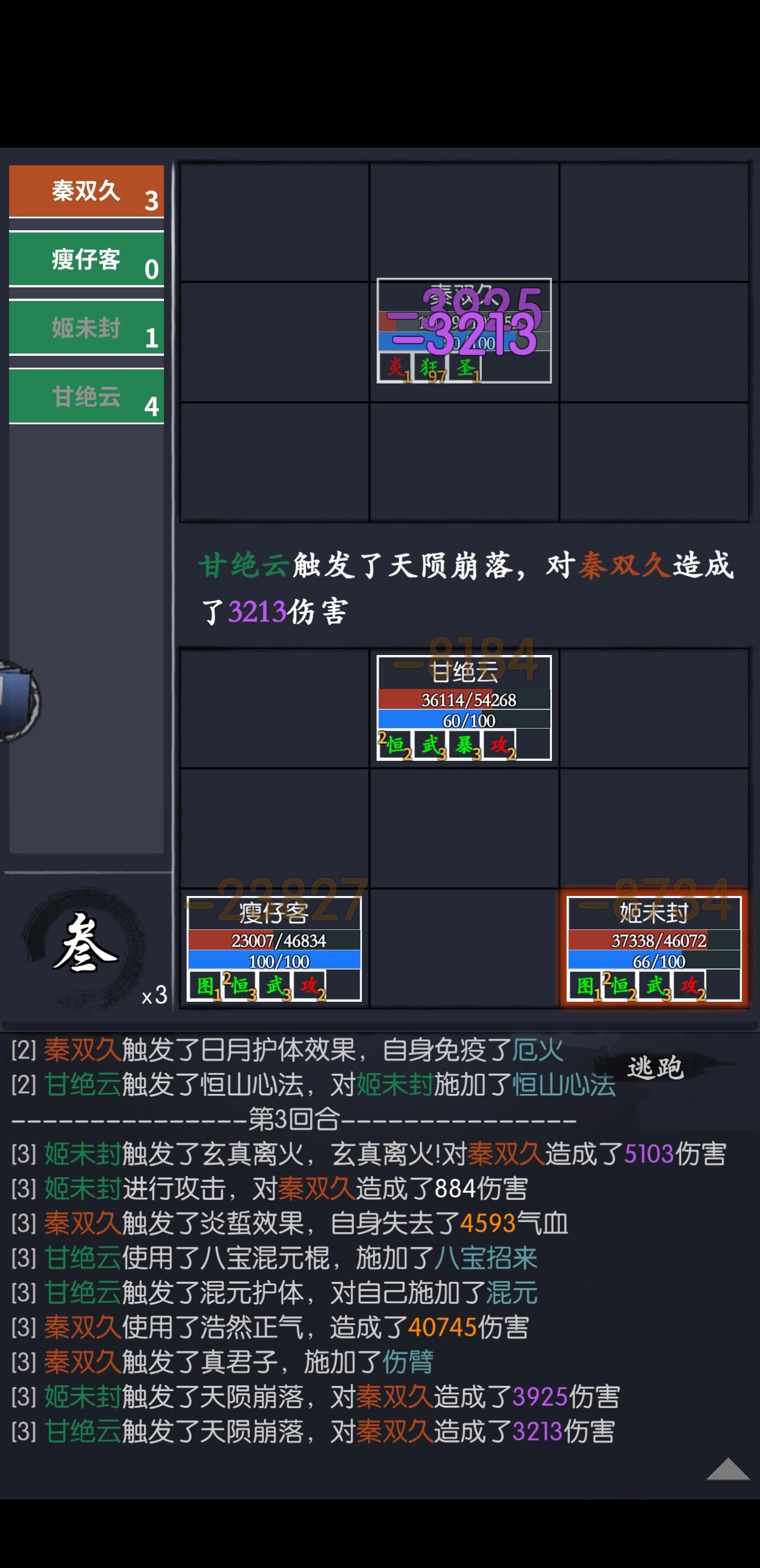 。主要是我的燕无伤一回合就被秒了,然后就来不及点逃跑了,所以我用其他侠试了试。 姬未封的反伤太顶了,能磨掉一半血,剩下 瘦仔客 胡旭 收尾即可。。所以可以是其他五关都打完之后,最后再打这一关,或者说雁无伤我再研究研究怎么配装吧哎。段曦伤害太高了