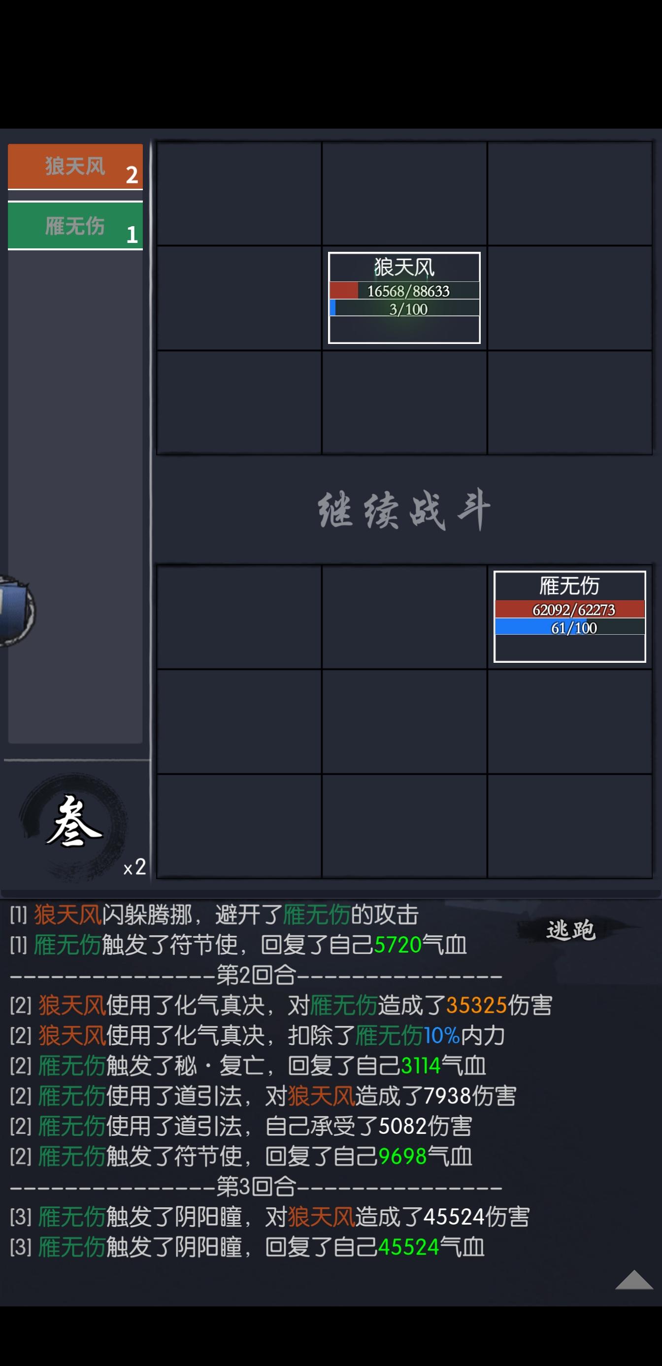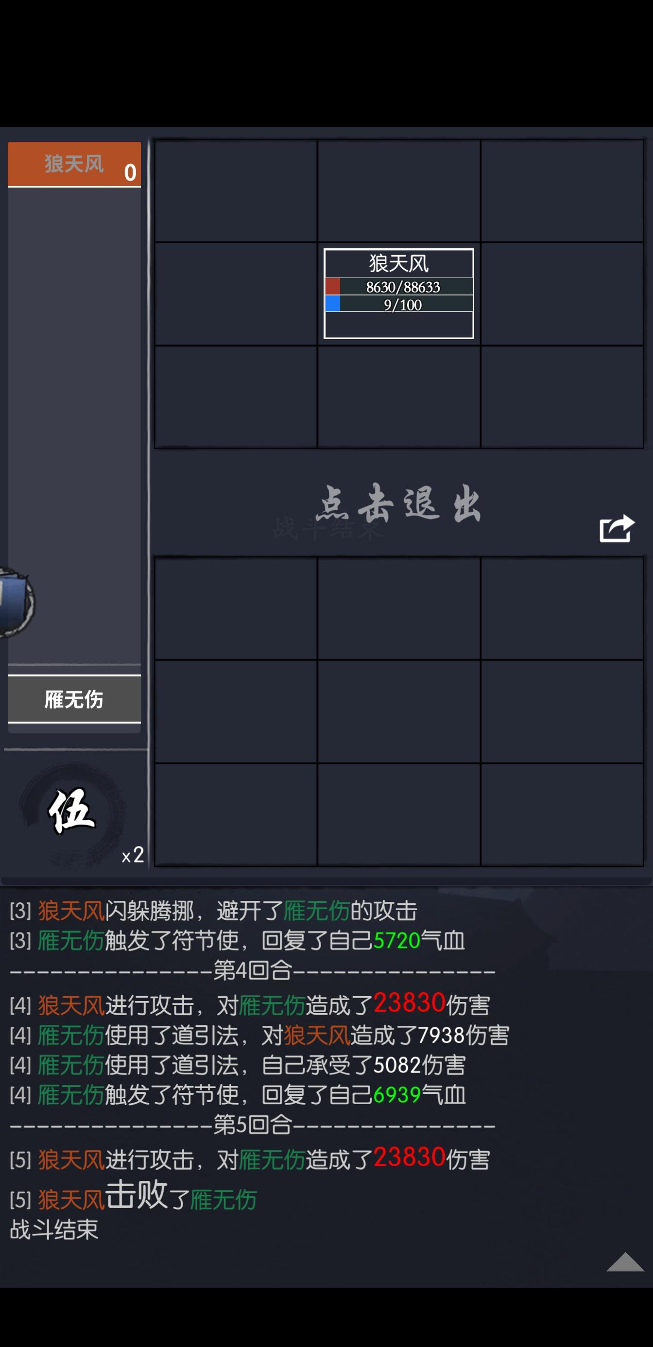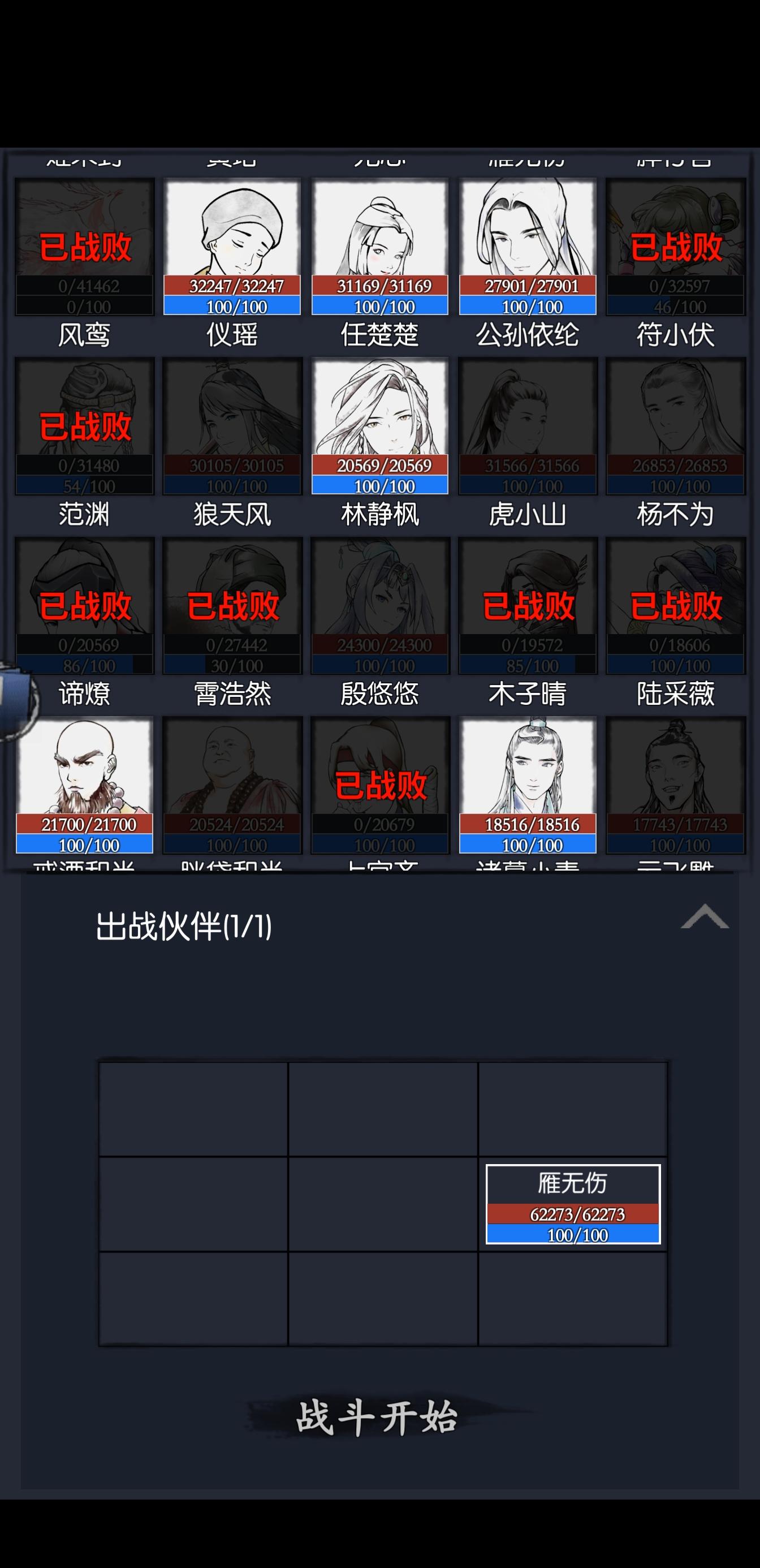 1.上很多很多侠客 磨他血量2.我雁无伤6.2w血磨到7w血为止3.凹两回合不出沉默,这样2技能雁无伤可以打一个最大血量真实伤害8k左右4.第三回合换血5.最后随便上一个侠客收尾