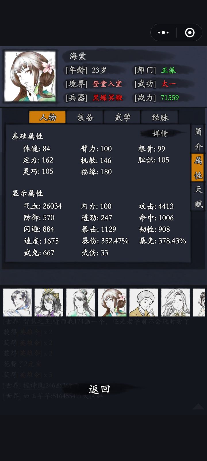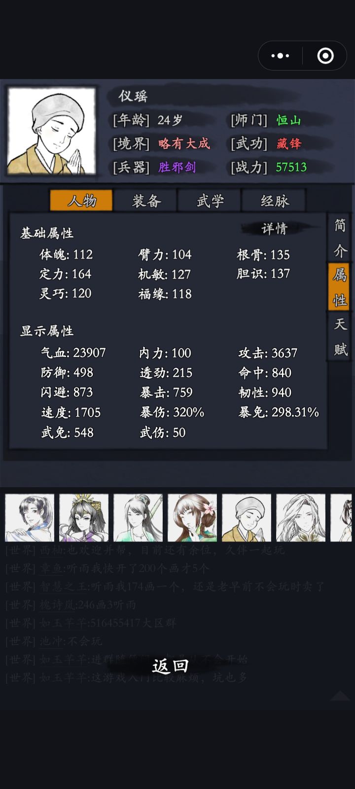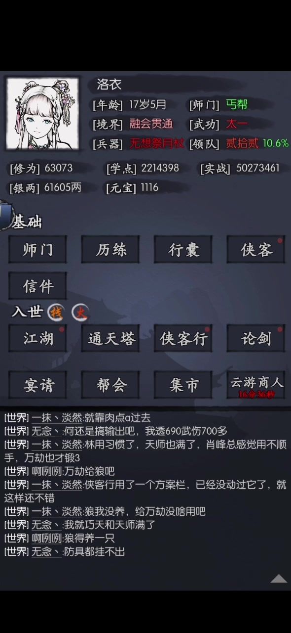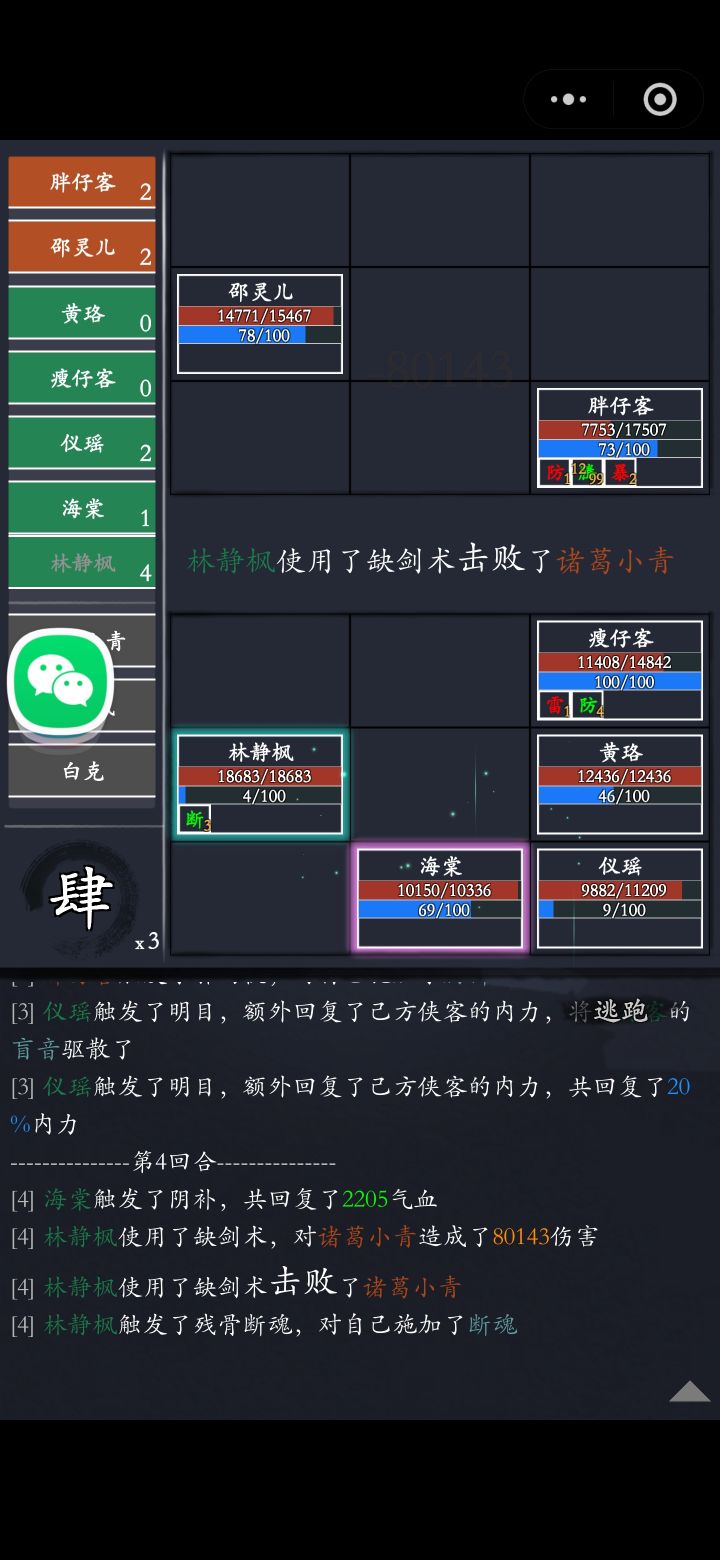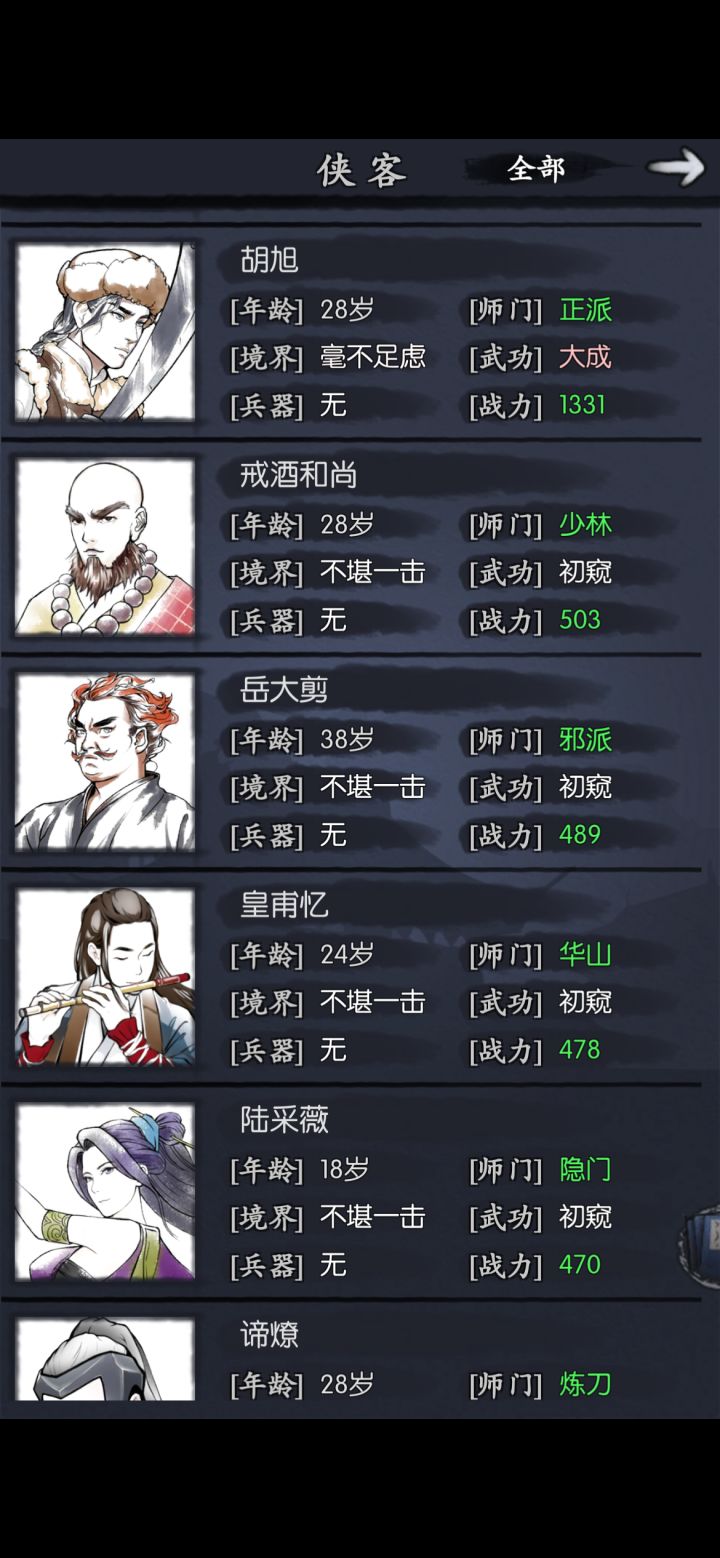 主上一个武学,战力降到3w9,看一下c不换位置不逃跑,完全无脑,侠客行是什么强度。 开篇是侠客面板装备和武学。 平时打要花的时间和这个差不多,献祭个侠客给过儿涨涨攻击,调下位置,素到最后三关是放不出来武学就打完了,今天不看秒进打的有些拖沓,所以时间久些,洛衣也死了。 降主战力侠客行强度会变很低。 可惜运气不好今天没出单抽和红。平常单抽和红装都挺稳定。有时两张单抽。 重在真实,不是嘛。[表情_开心]