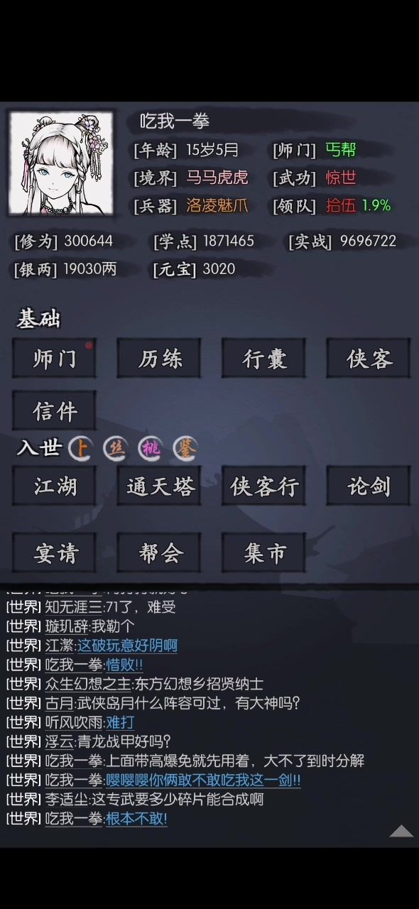 最近看攻略养了一下黄珞行囊里行囊里的道具用完+本期海客直接拉了60金之信物,一共使用30+5+1+1+10+1+1+1+20+2+2+2+2+2+2+40=122122+35=157157+3+3+3+3+12=181碎片1-1 1-2点到4级 2-1点到7级+开3脉+内功咱就是说第一次把这个侠客梦打通30关(之前所有其他侠客打到20关必打不过)恶人谷把胖仔克换成黄珞之后,能从打过第六