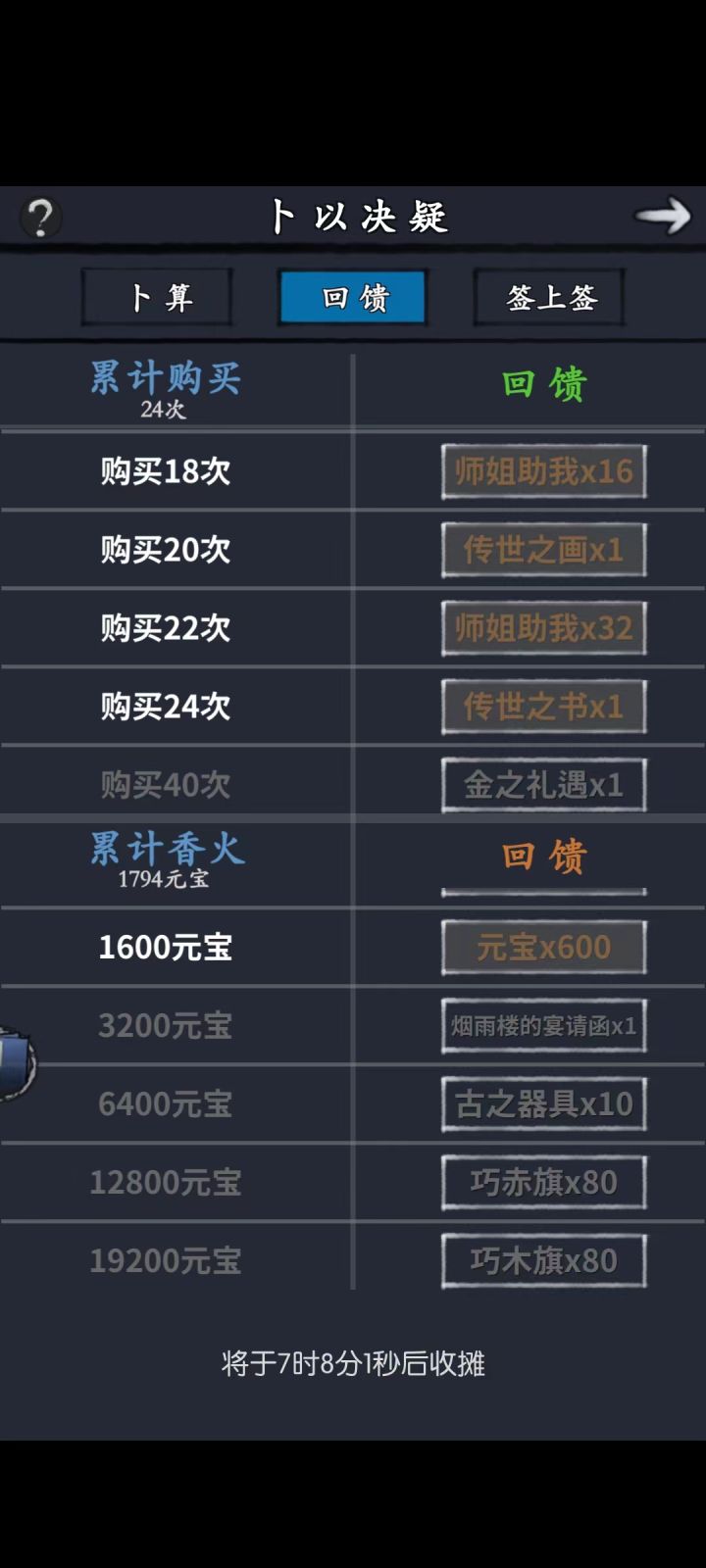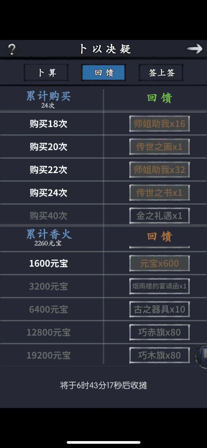 玩法不多说了,直接说结论,先看图。第一张:楼主这次卜卦后两张:上次卜卦楼主和一个小伙伴的卜卦。吐槽:这活动改过了,建议别看很老的攻略,听老登们说,以前出古董概率大性价比高,现在你刷三次都大概率见不到古董,刷新很浪费银两。一.平民玩法结论:1.新手第一次卜卦可以凑满6400元宝24次。2.以后卜卦建议凑1600元宝12次或16次。3.攒了很多师姐师弟可以如图二图三去凑24次大概2000
