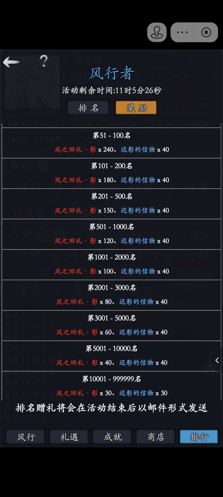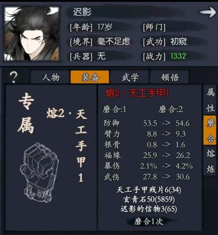 对于白嫖党,当然要把每一个元宝花在刀刃上(氪佬可以划走了……)迟影玩2技能出肉打辅助,信物消耗如下;技能一各点一下:15个觉醒:30个技能二拉满:130个三脉:35个一内:24个(为了内功效果,扛爆伤)专武就不要了,属性不太行总计:234个再有多余的信物,可以点一下主脉五脉(20个),减伤6%,其余经脉不要点,总计254个。需要买:银两风羽拉满,消耗25万银两20元宝风羽5