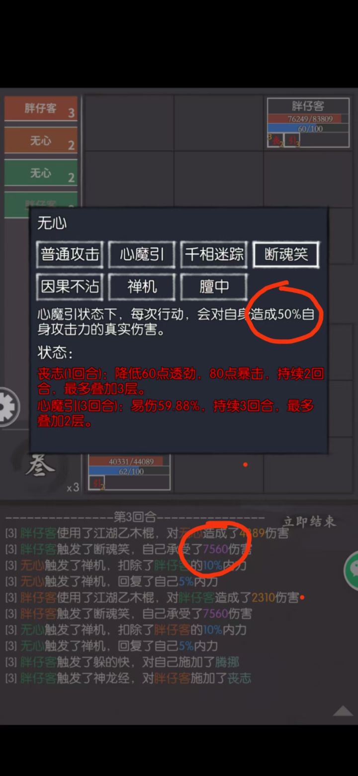 bug1:推测效果为双方同时上阵无心时,挂到心魔引的侠客会受到来自己方无心断魂笑和对面无心断魂笑的两份伤害。大概能理解这个bug是怎么搞出来的,顺便一提我之前反馈的无心死亡后1-1,1-2不生效还没修呢,蛮好笑的。bug2:被陆采薇的银锁穿魂抽死或者被姬天子天崩陨落打死,不会释放因果不沾