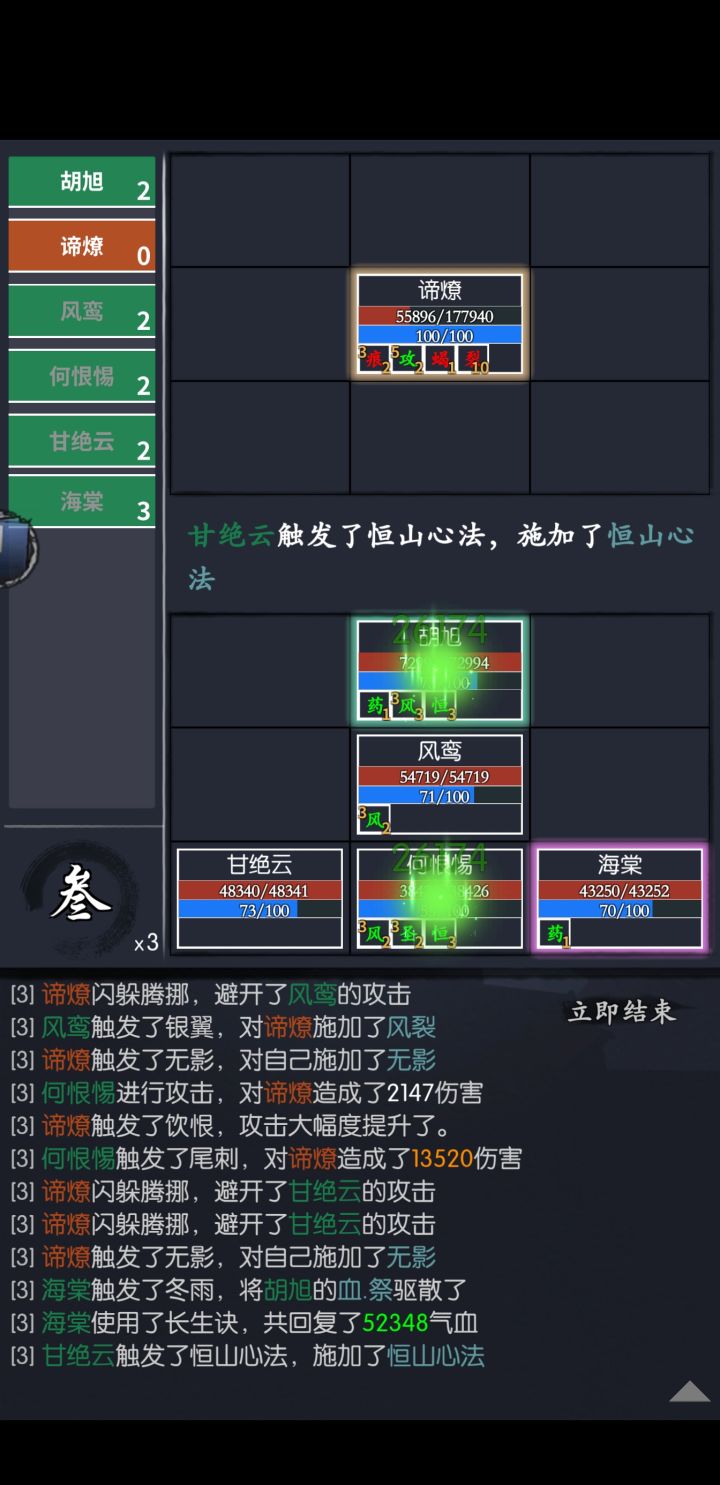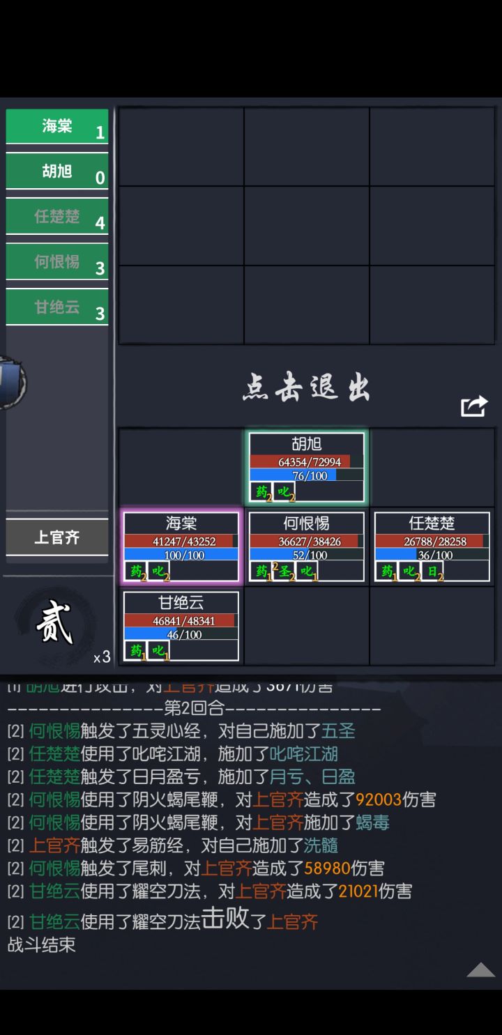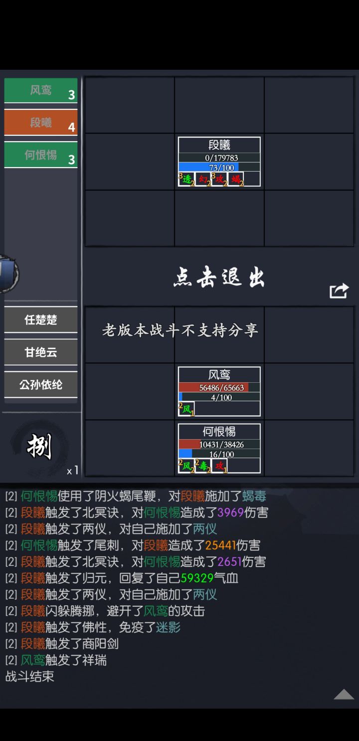 天涯海阁秋左上4(其他1v1打不过) 无心 易伤60% 凤鸾 防御降低 12% 任楚楚 加透劲减防御 可惜我命中太低了,爽不起来(下个周已经熬了一个小时,天涯海阁1v1了,太阴了,不打了,去挑战一下阴阳隙试试咯)