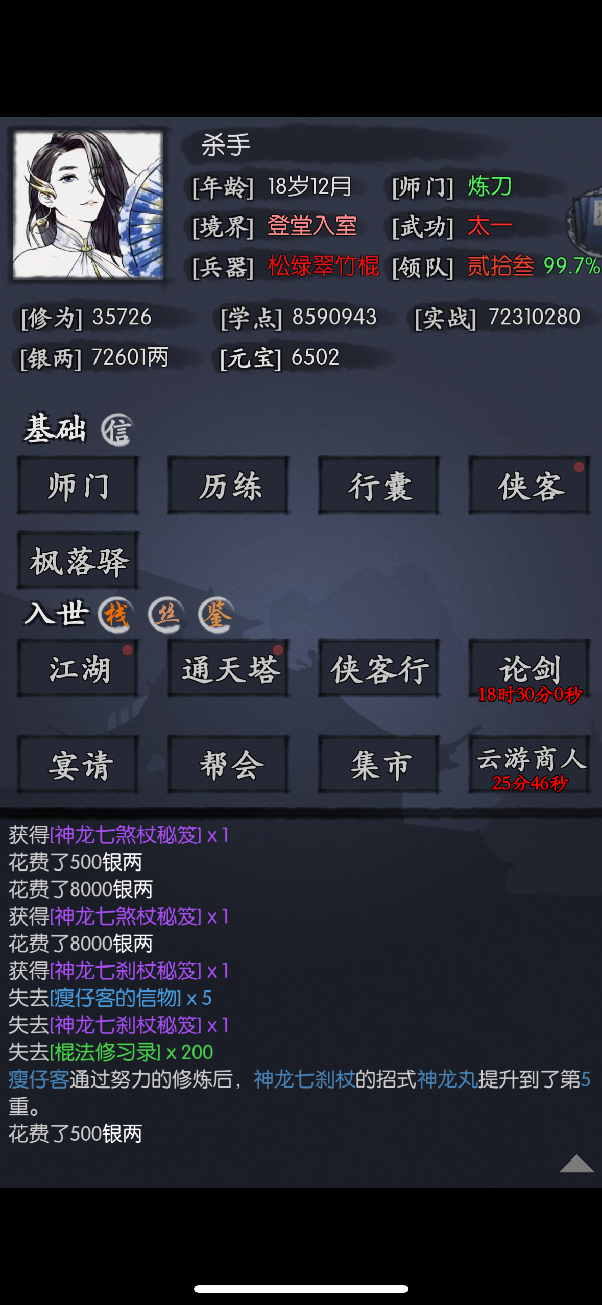 如图,我买了3本神龙七煞杖秘籍,瘦仔客武学从4级升5级用了1本,然后3本都没了