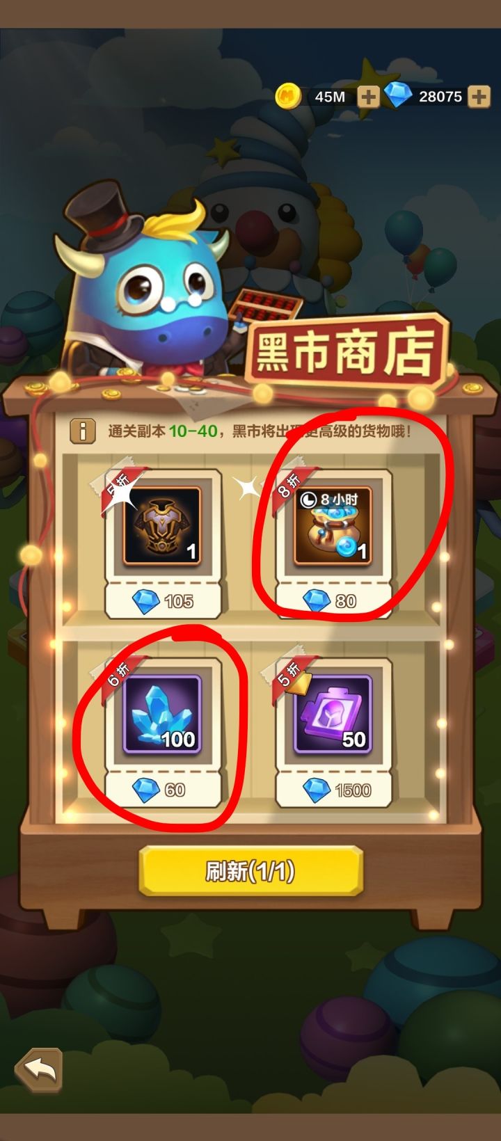 游乐场黑市就买图中圈住的两个,还有酒馆那个券,1500钻石50个紫色碎片那个尽量还是不要买,不太划算,砸蛋的话遇到钻石,假如说没砸到,推荐购买最后一锤,20钻石换几百钻石还是挺值的。◤见图四,图五◥