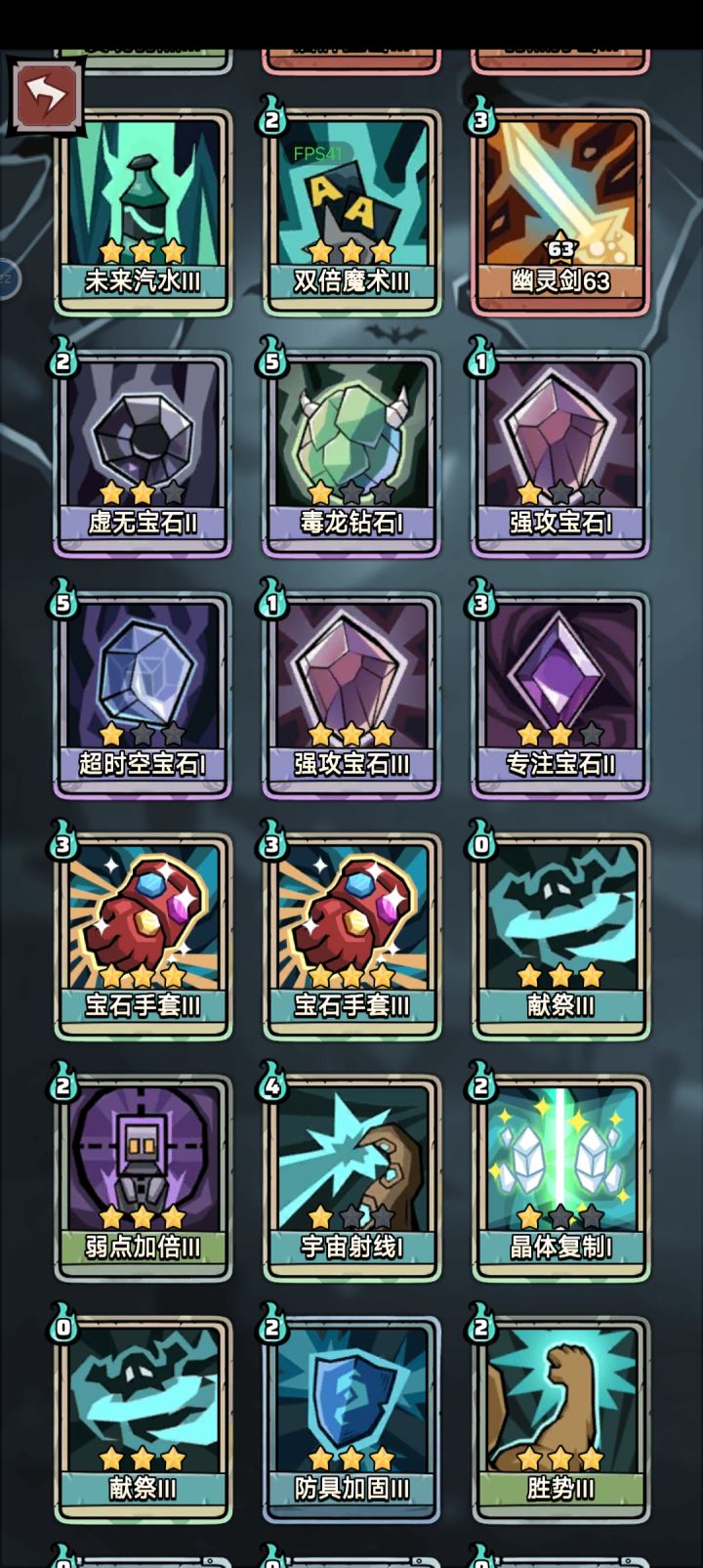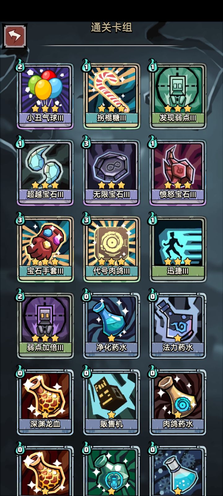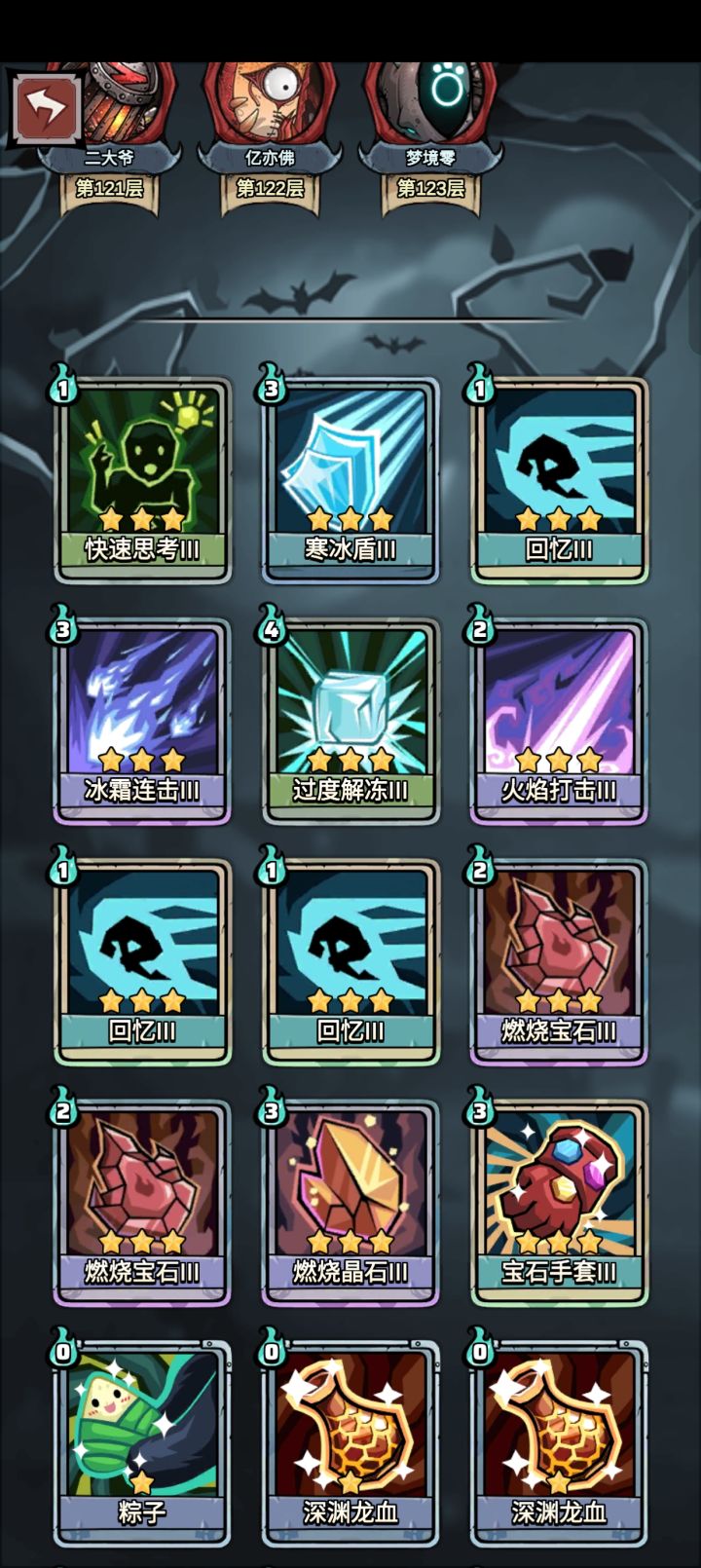 触发法师天赋:魔法禁书+曜蓝石甲(+2法力上限) 战斗开始100点知识,添加印记翻倍 循环核心:无限宝石+快速思考+威慑/洞察 法力回复:魔塔石像+快速思考 魔塔石像1个循环洗牌2次回2法,快速思考手中1张牌回1法,弥补威慑/洞察2法和快速思考1法消耗。 输出核心:白胡子手办+诅咒骨血(易伤转毒) 初始易伤:生死对决(+30易伤)/诅咒项圈(+20易伤)/射手护腕(+5易伤) 法师的优点是有印记翻