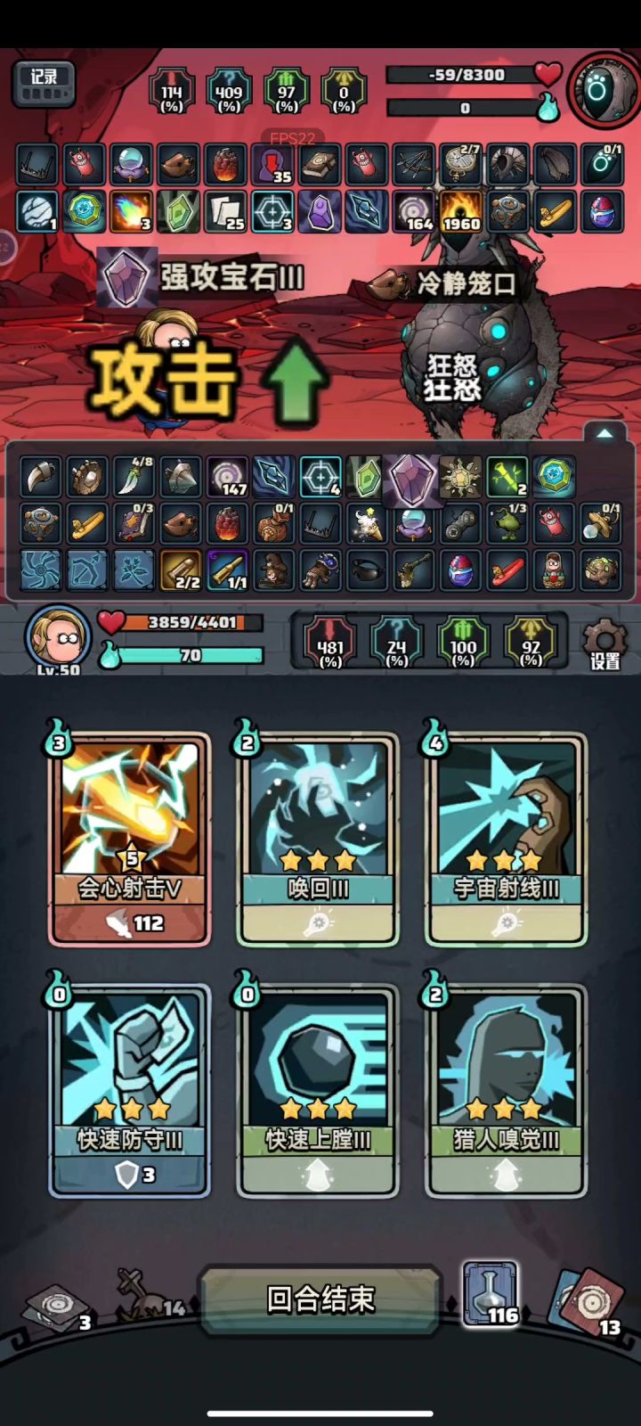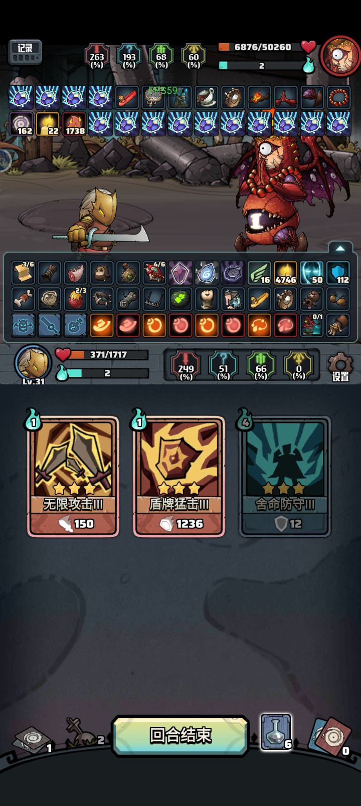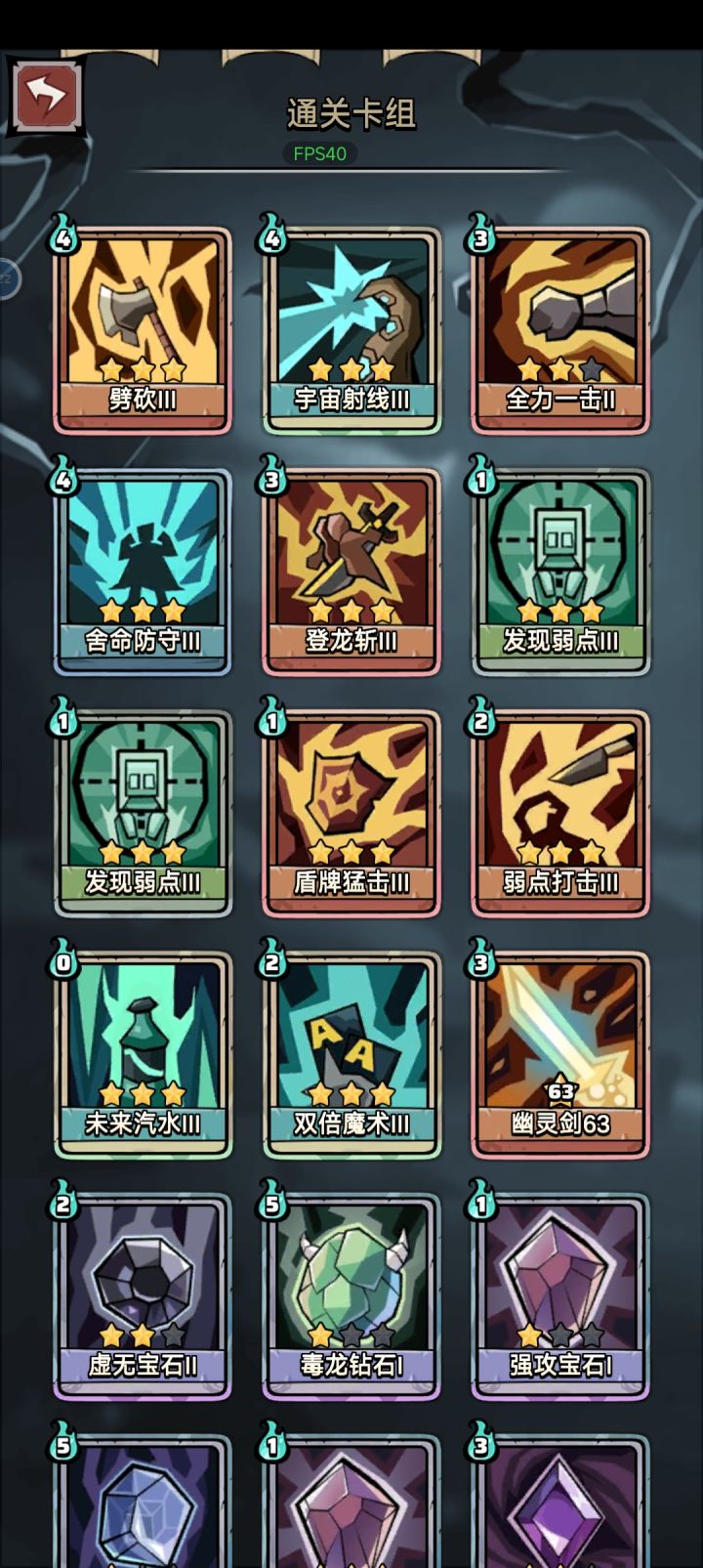 触发法师天赋:魔法禁书+曜蓝石甲(+2法力上限) 战斗开始100点知识,添加印记翻倍 循环核心:无限宝石+快速思考+威慑/洞察 法力回复:魔塔石像+快速思考 魔塔石像1个循环洗牌2次回2法,快速思考手中1张牌回1法,弥补威慑/洞察2法和快速思考1法消耗。 输出核心:白胡子手办+诅咒骨血(易伤转毒) 初始易伤:生死对决(+30易伤)/诅咒项圈(+20易伤)/射手护腕(+5易伤) 法师的优点是有印记翻