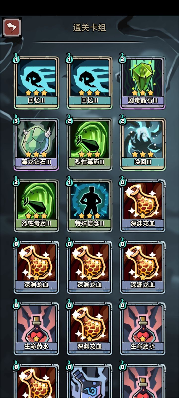 牌组:超越牌:回忆2,唤回1;宝石牌:剧毒晶石1,毒龙宝石1技能牌:烈性毒药2,特殊信念1备注:在没有拿到诅咒骨肉(易伤给毒)的情况下,建议带个毒药攻击。任务选取:1. 植物精华,毒层数不减,但伤害减半;2. 开局赋予30易伤出牌顺序:开局易伤给毒(没有就用毒药攻击),先用剧毒晶石+毒龙宝石,烈性毒药让毒层数翻倍,再来一次,唤回再来一次,再给一个特殊信念,每3层中毒带来6层祈愿;回忆