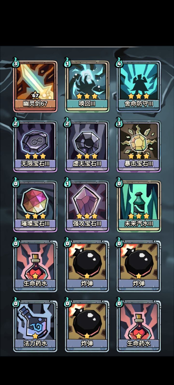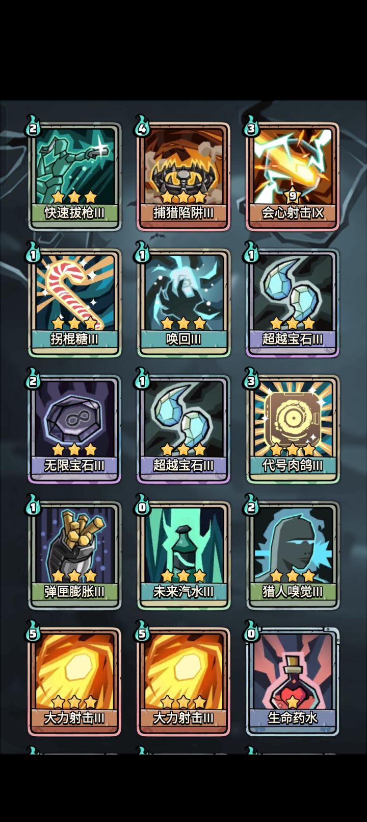 初始宝物:可以选择子弹勋章或者迷彩外套 最后选择瞄准镜核心卡牌:无限宝石 换回 献祭 弹夹膨胀 (选择瞄准镜宝物的话额外需要炸裂宝石与海王鲨鱼)配卡:猎人宝石 无限宝石 超越宝石 代号肉鸽 换回 献祭 试探 弹匣膨胀 火力压制 宇宙射线(前期:过度堆血避免后期暴毙 后期:直接删卡)事件选择:金币子弹 啤酒肚(选择迷彩外套选择)其他看自己需求选择这个流派就是把子弹叠满了用试探与火力压制来回打