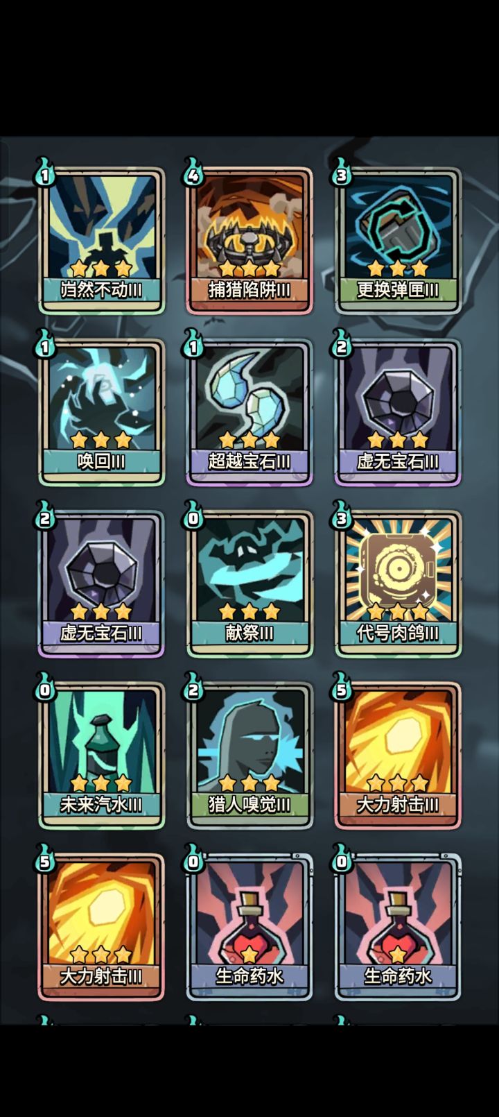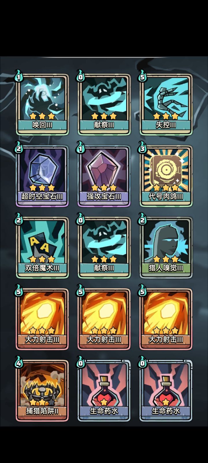 普通牌:大力射击*3,捕猎陷阱*1,猎人嗅觉*1超越牌:献祭*2,失控*1,唤回*1宝石牌:攻击宝石,超时空然后就无限失控,献祭,唤回,嗅觉这个是我抄的大佬的对了,洗牌后期给我删了,有一把我眼看着无限洗牌,然后差点把自己洗死了