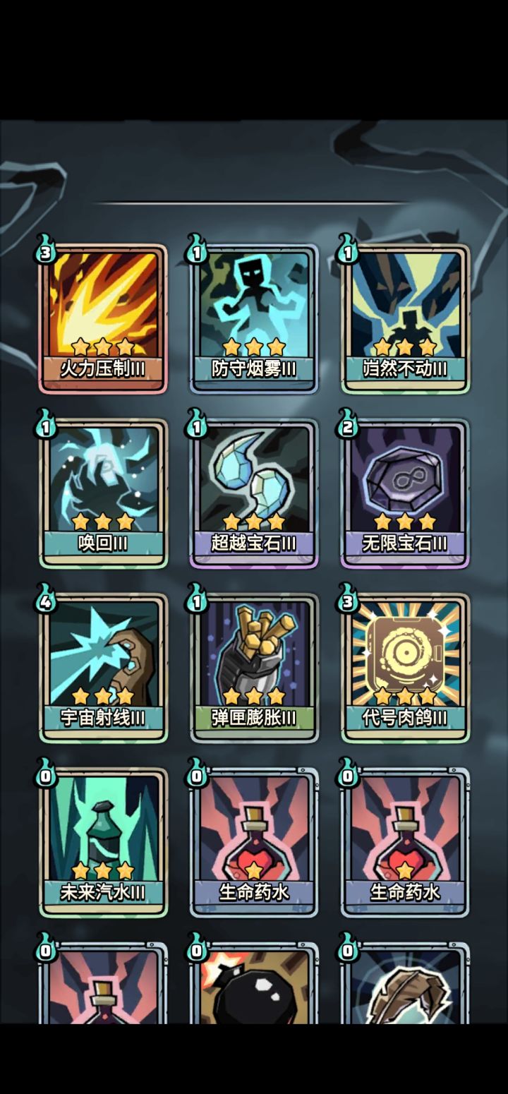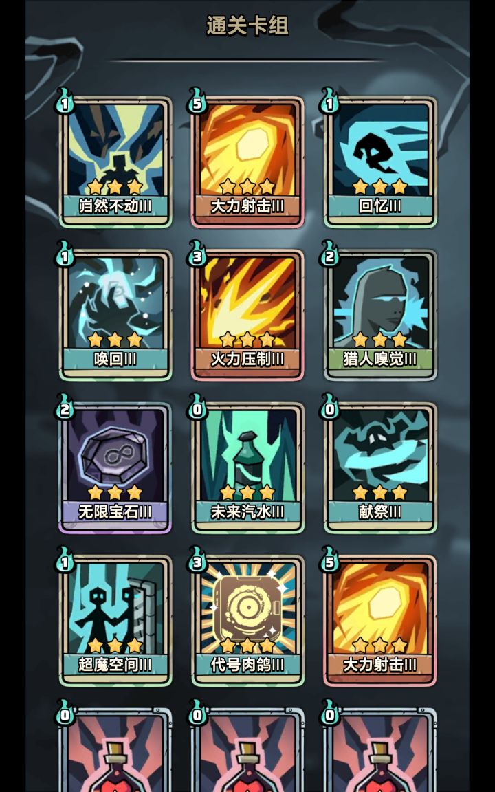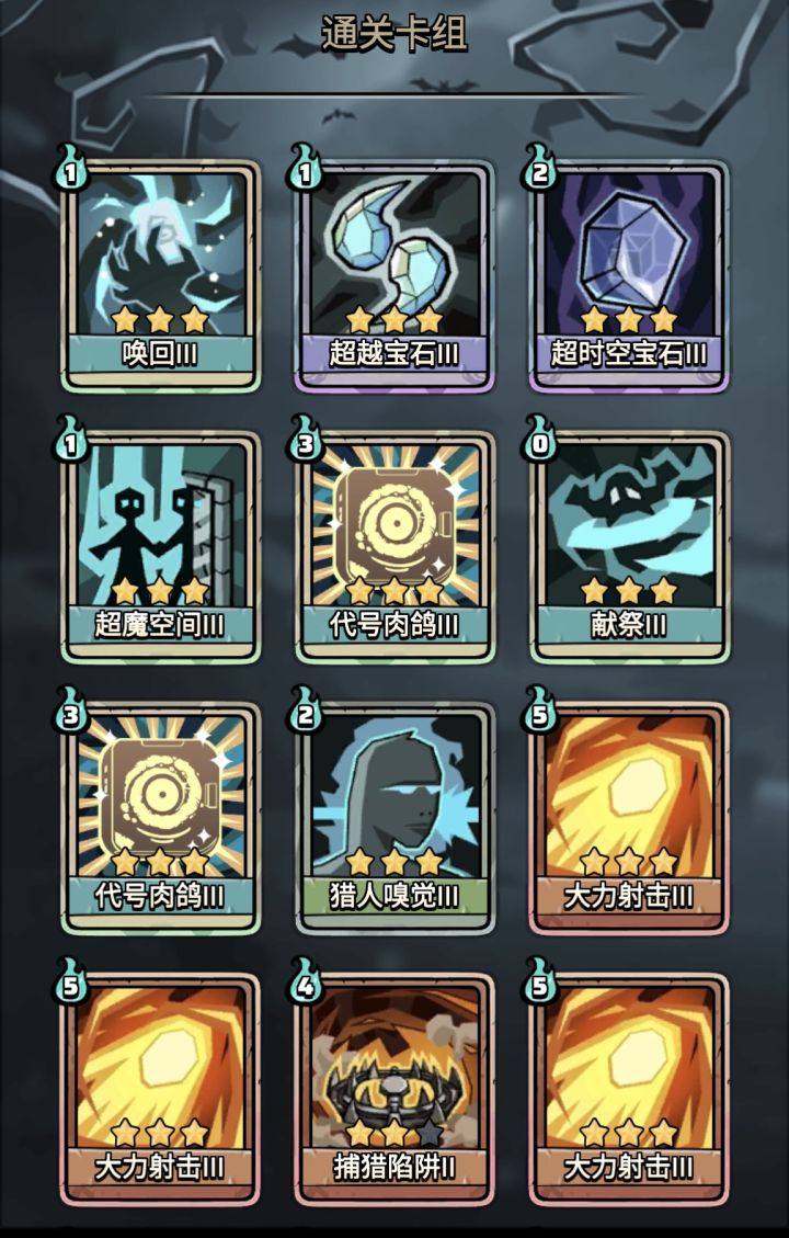 这套优势在于前期输出也高,成型简单。成型后没有天敌。不管是怀表愿望亡灵都能打,挺稳的。核心输出:唤回+弹匣叠满后火力压制输出。因为弹匣容量有上限,所以后期伤害还得靠代号肉鸽来增伤。小贴士:射手的防守烟雾比回归好用,造价还低。有无限宝石的时候比回归更好触发抽牌,因为无限流后期过牌全是超越牌,所以把回归换成防守烟雾的话一轮能多触发两次无限宝石的抽牌。后期牌组成型后建议塞一张岿然不动进去。成型后