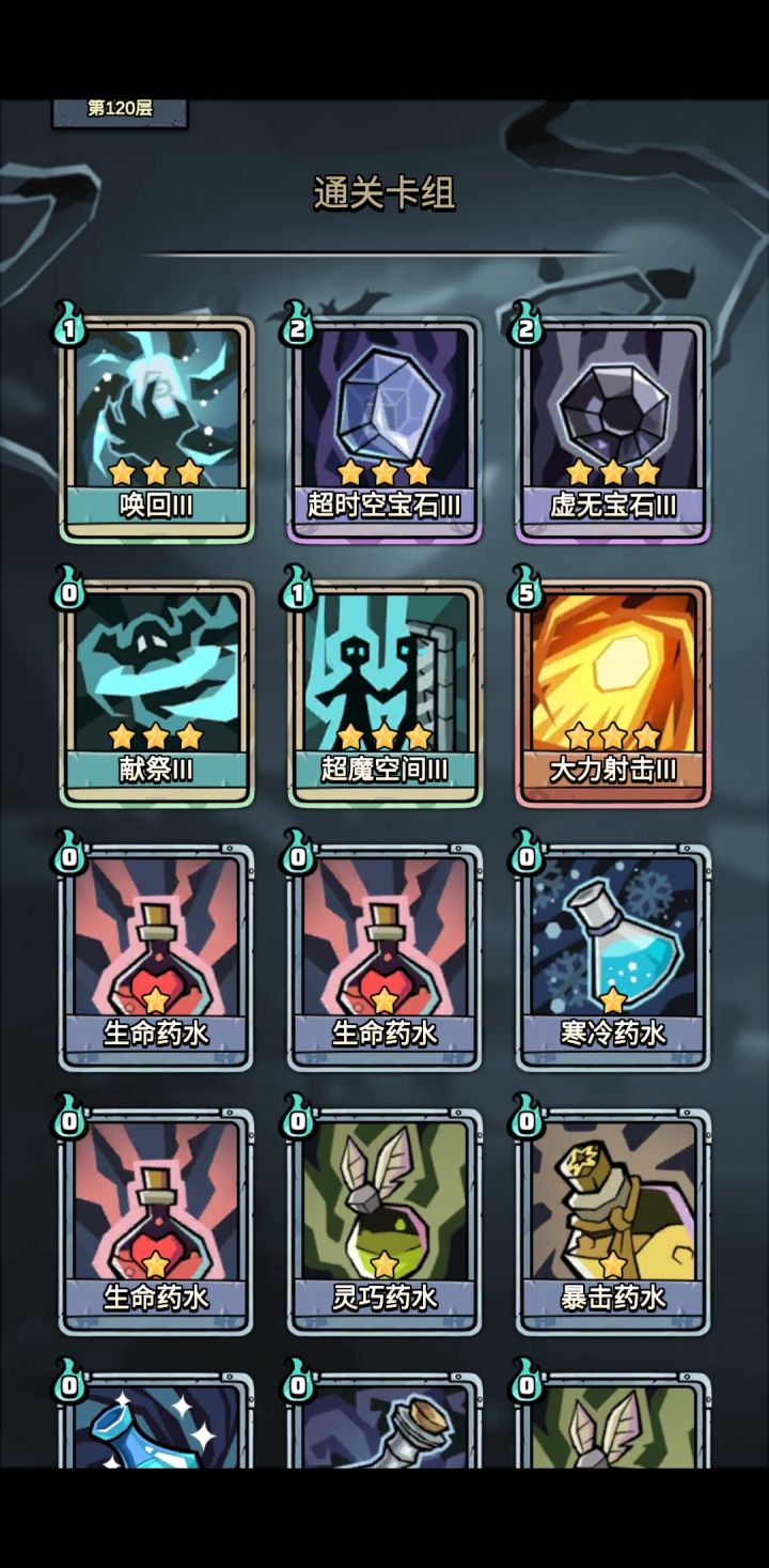 通用公式:无限 超时空 换回 汽水 肉鸽 任意无属性攻击卡初期选择一到两张强势卡过渡前期,无限超时空都有之后搞一张宇宙射线偷生命(如果嫌麻烦要拼脸和操作可省略这一步),然后删除宇宙射线提高稳定性。看个人情况,我习惯刷到2000血再无脑推120。宝物选择只影响速度,看情况选。任务影响不大,会影响卡组的不要,例如复制类。任务可以选下一层10%钱,道具卡有用的:炸弹,加血,洗牌,咖啡,法力药水等。最