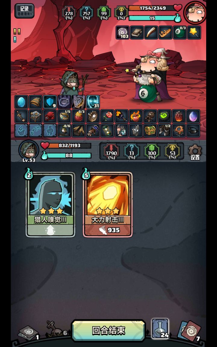 无限宝石配无限法力,大力射击配合猎人嗅觉输出,火力压制补位,刷钱套装加攻击,没有弹匣加持输出也能搞上去几个龙蛋到手复制物攻牌加超越牌,两个回合即可结束一个怪