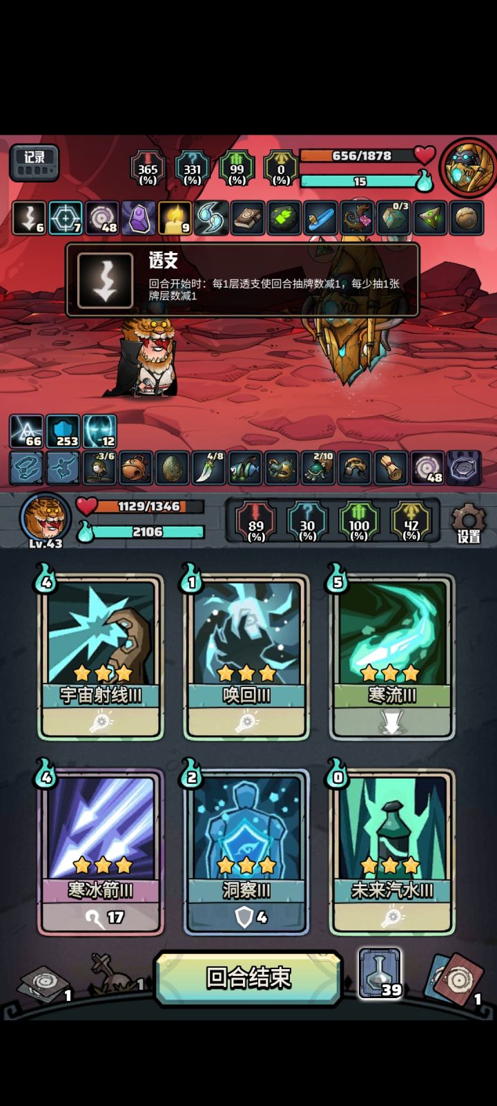 通关120层,遇到免疫寒冰的,不过我的能量很多,就算是每次8点伤害,都可以耗死他们,120层最大血量很关键有的boss有反伤,一但血量不高,很有可能暴毙,基本都需要前几回合直接把boss秒了。我这套卡牌主要有四个玩法,一个是无限能量,一个是无限叠高冷,一个是无限无效对方卡牌,一个是无限减少敌方抽牌数。一般只需要放两个寒流,boss手里没牌,就会过到自己回合。卡牌构成:宇宙射线(无限叠加最大生命值)