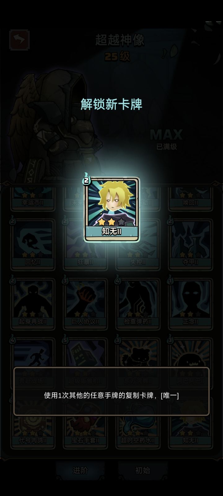 知无:使用1次其他任意手牌的复制卡牌,[唯一]本质是无消耗的复制牌,手牌中留下核心牌,就能用【知无】代替使用。【知无】单独没有任何效果,但可以配合各种套路使用,强度由套路本身决定。目前3星为1法力不移除超越牌,常用思路可以将高法力消耗或移除的牌用【知无】代替使用,达到降法力消耗或不移除的效果,而且配合超越宝石能够恢复法力。无限循环核心:无限宝石+超越宝石+知无+任意卡牌任意卡牌:1、各