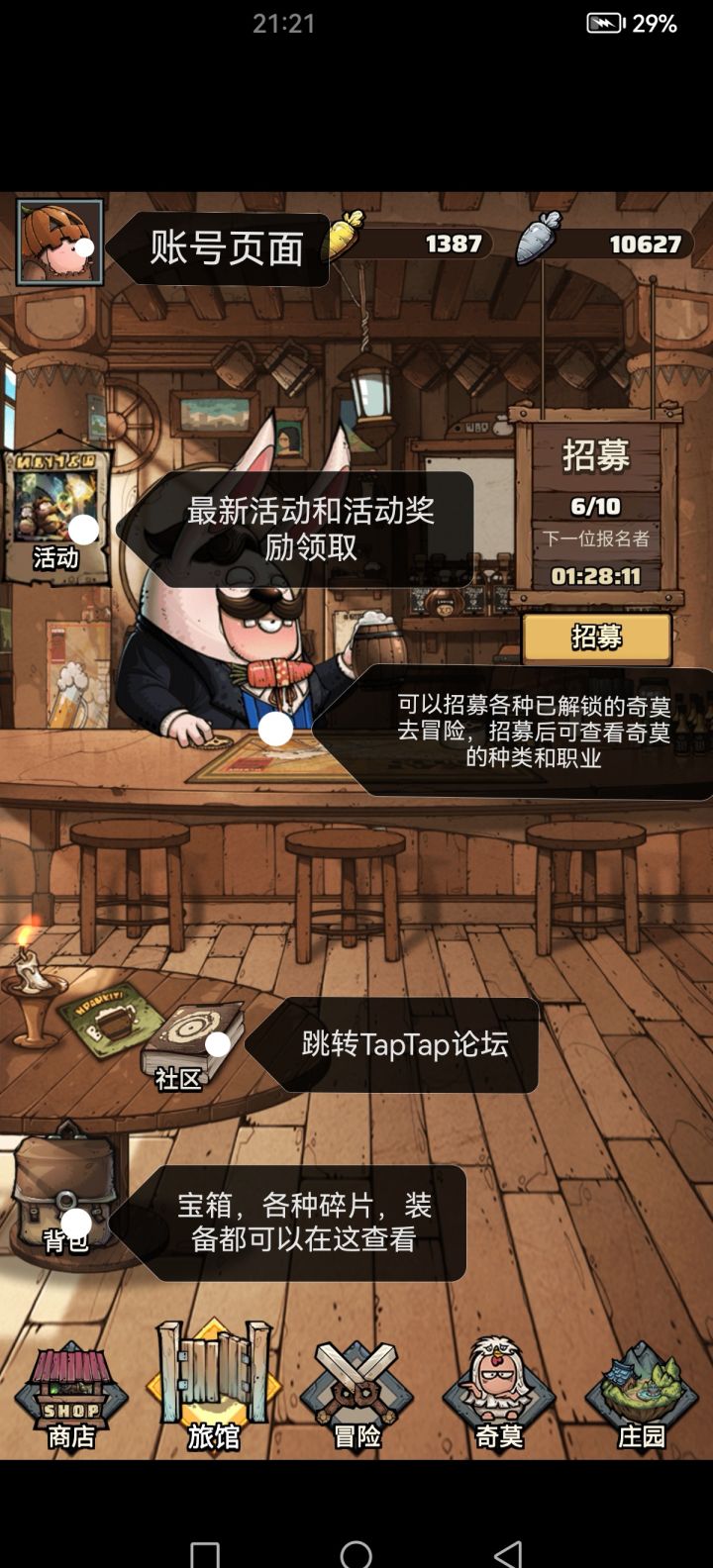 一、主页面二、商店差不多6、7个小时刷新一次,推荐用金萝卜购买银萝卜,用银萝卜解锁自己喜欢角色碎片三、冒险页面建议快速推进主线到6-1以便解锁各个功能四、奇莫页面1.已招募的奇莫在通关一次主线或木屋后会归为转正奇莫2.奇莫存在初始寿命,每次死亡寿命-1,归零则会删除该奇莫,随着角色种族等级增加,每次招募到对应奇莫的寿命也会增加五、庄园页面补充:一、招募a.主页面招募优点:可