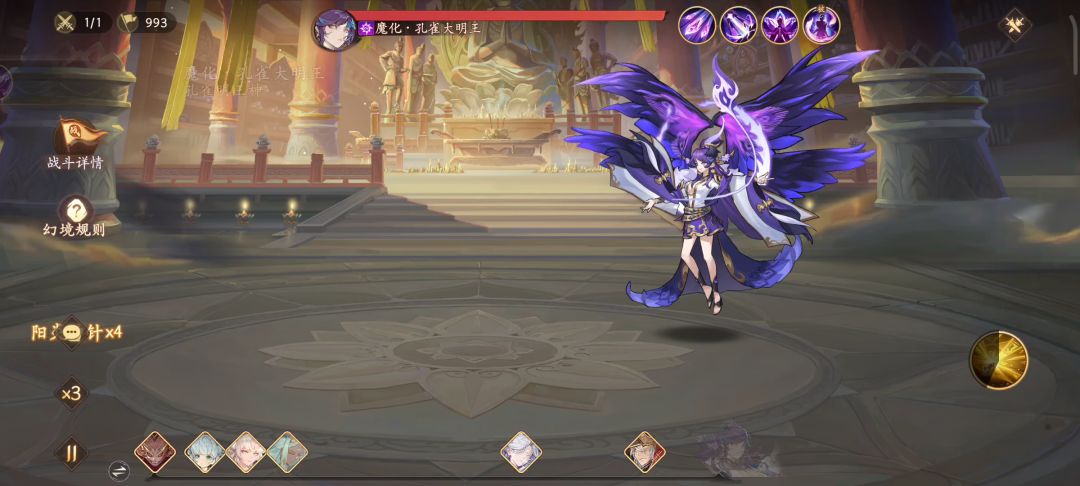 本人攻略均经过三次以上的实验,现在拿出来呈现给大家。首先声明一点,为了考虑新区很多人没有白骨,所以就不带白骨了,并且不带其他限定角色。有白骨换杨戬,六耳站前排即可。角色战力:装备方面,输出常规速度加暴击套,杨戬反击套加吸血棍。羊神凑80命中4000防,杨戬起码3000防,孔雀选奶妈最优,堆肉就OK。首先给大家简单讲解一下黄风的机制。有两点点需要注意:1.众生阵营攻击会减它冷却,所以就不