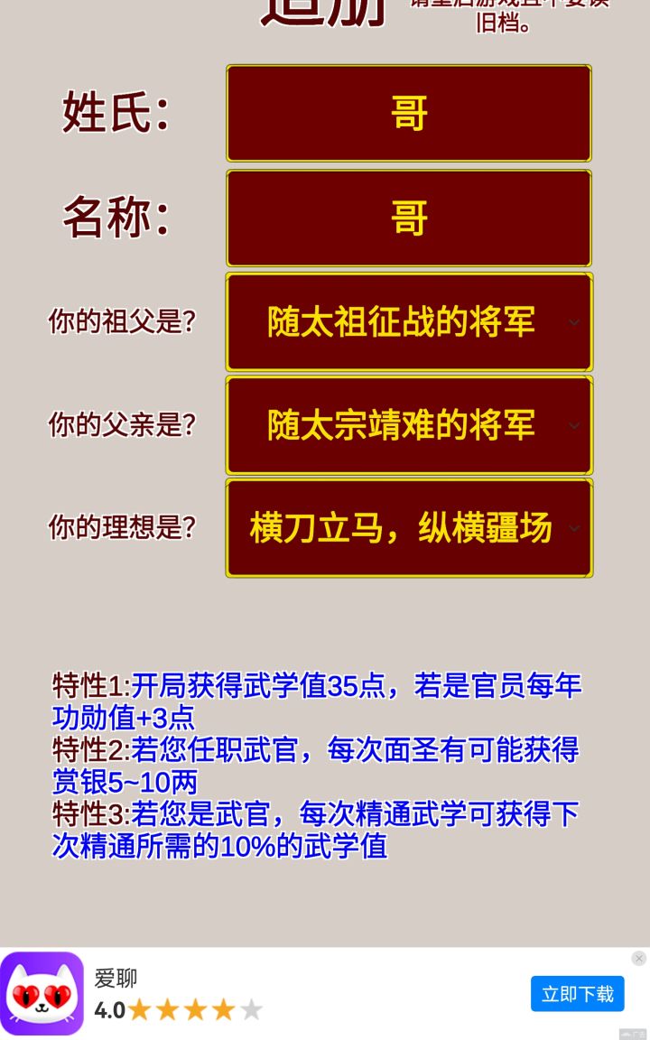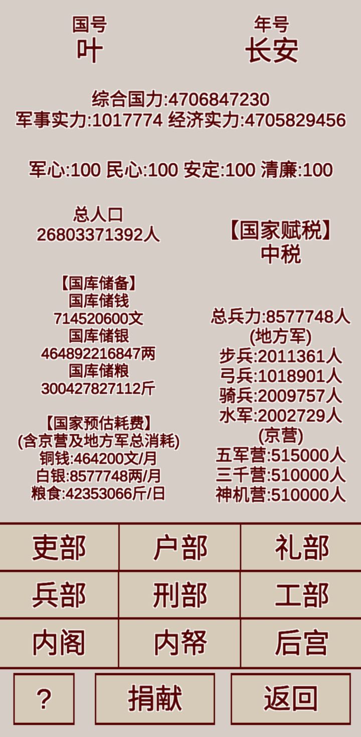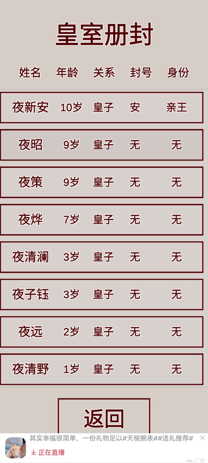 又到快称帝了,遇到的bug。1,是角色的父亲不知道为啥去世了,但是健康值还可以增加,因为我是有管家的时候他去世了,这个时候可以对话操作并且进行手动增加健康。2,虽然说纳妾年龄是变小了,正妻并没有改过来。3,钱庄存钱6个月和3个月,高风险的情况下收益是一样的,反正就是2个3个月是半年收益的两倍的样子。