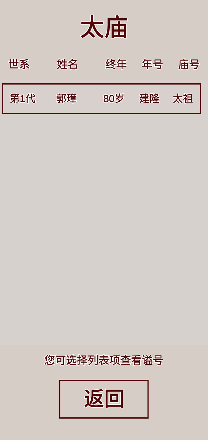 1.皇帝去世后要显示一下年号最终用了多少年比如乾隆60年,朝代结束要来个总结,每个皇帝年号出现一下。 超级工程:写在皇帝下面,主要城市:城市人口超过500万的列出,比如乾隆5年修了陵墓,乾隆10年修了大运河,乾隆50年征服日本,乾隆60年设立台湾省,一共设计了几次科举,主要城市:12345每个城市人口,全国受教育率0.1%2.户部,既然可以发型钱币,游戏中可以把钱币做出来,户部拿过来样钱,同意后