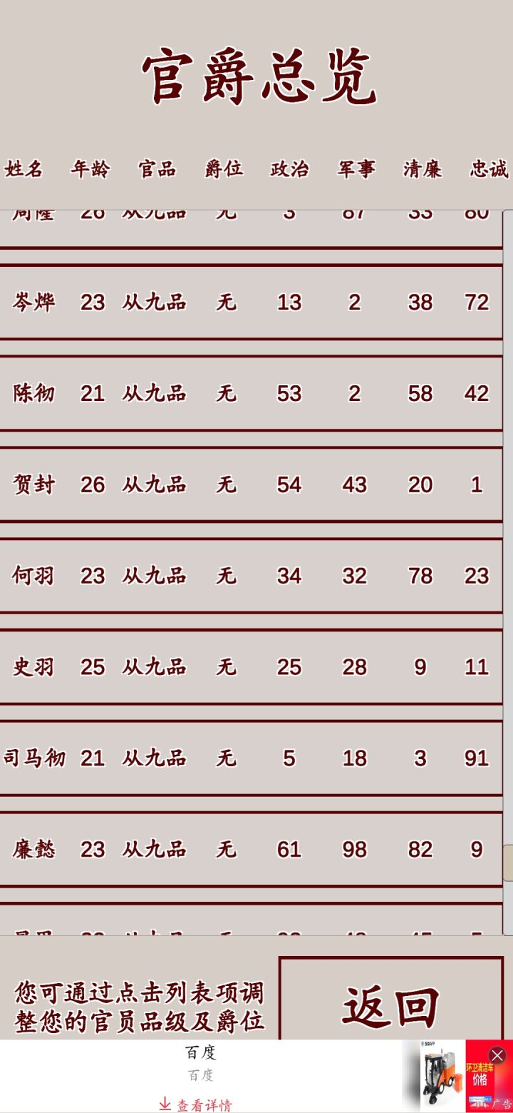 建议当上皇帝后,换官员智能一些。。。 我名字和官职匹配不起来😔 能不能那种就是:做个表格,把官职,人名,政治,军事,清廉,忠诚放在一个表格里,换也在这个表格里换?