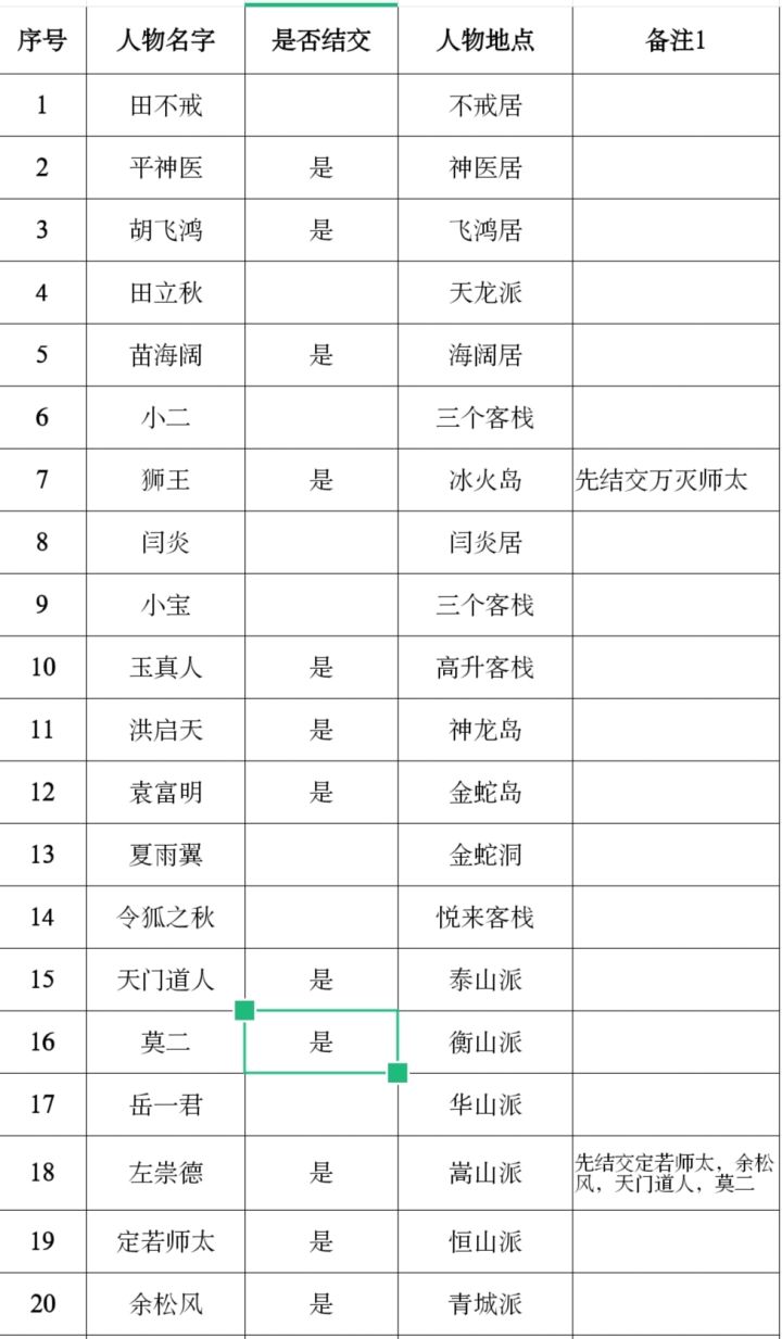 连诗山洞:万春秋(神照经—丁一侠)、言山河(玄铁—神经照)、戚毅江(小芳—神经照)福建镖局:小林子(爆辟邪剑法,任务找余松风得5个祝福宝石)衡山派:莫二(任务找令狐之秋,得华山心法)不戒居:田不戒(任务5个降真香1两银子)阎炎居:阎炎(胡家刀法10两银子)梅宅:任天地(打败任天地任务得吸星大法)慕容老宅:王姑娘朱儿海阔居:苗海阔(任务切磋得华山剑法,教训阎炎和田立秋得10两银子