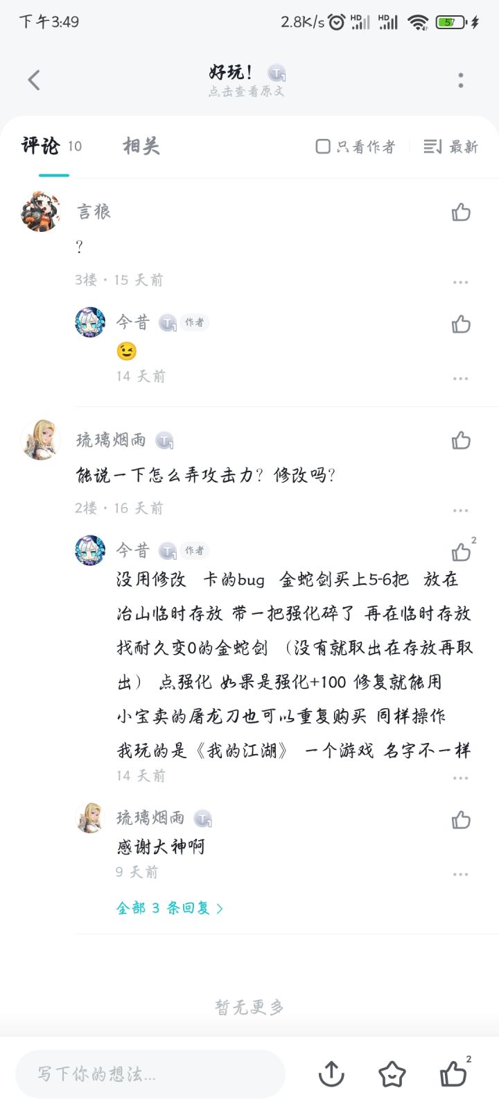 我知道的bug3个白嫖bug 随便把一个物品给他 然后按住交易键不松在把他的物品和你的点回来 再松开交易键 如果成功会直接关闭交易界面 耐久度bug 多个同样物品放在家里 武器或者防具都可以 放过之后 退出游戏 把游戏这个后台清了 重新再进 耐久度会直接叠加强化bug 我没卡成功过 卡出来耐久度为0的金蛇剑 再后面不会操作了 后面附图一张小技巧1.每个常用的白嫖点 比如金蛇洞 客栈 放几