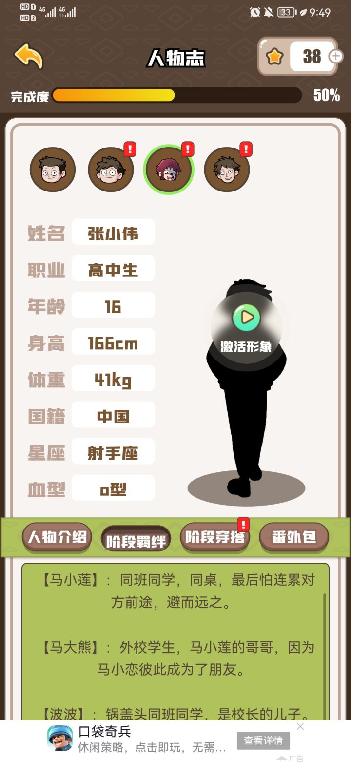 游戏很好玩,就是一直要看广告有点烦,我想看人物志啊啊啊啊啊啊啊!但是每点一个就要看广告!希望作者可以出个买断制的那种,就是6块10块去广告的那种,一直看广告真的让人没什么欲望一直玩下去555555555,主要是本来就是抽空玩结果还要一直看广告,十块以内去广告我完全可以接受的!