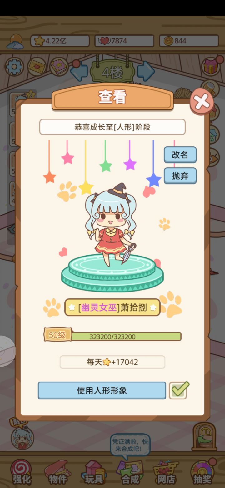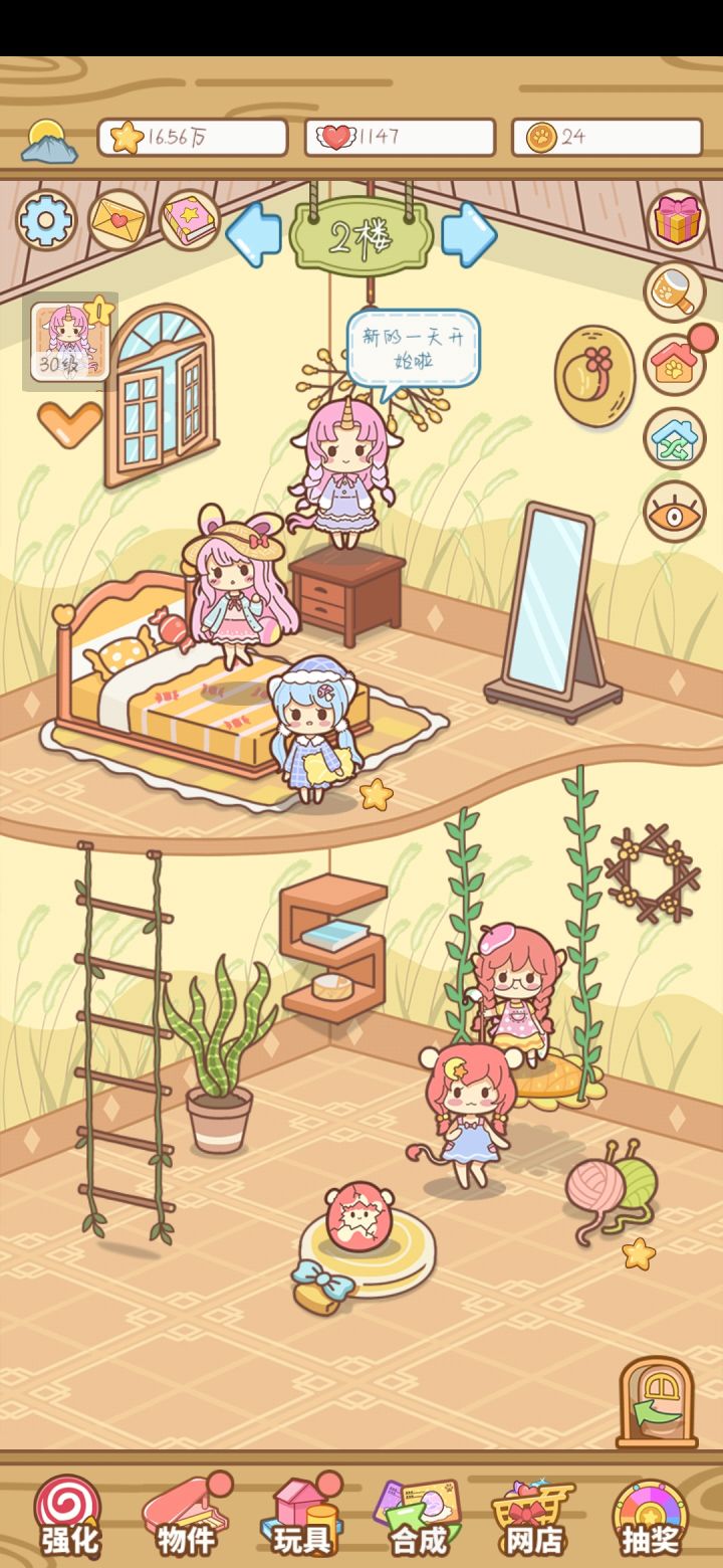目前的一些发现1.宠物玩玩具可以加经验,独角兽玩完弹弓之后就升级了2.可以移动的宠物才能玩玩具,一直在垫子上呆着的不行3.星星的作用只有升级家具,升级的家具只能加升级产量,所以好像完全不用管这些,好看完事,星星对其他方面无用(已证实有部分错误,升级强化家具,背景都可以加速宠物升级进化)4.左上角展开房间内宠物列表,点某个已化形宠物,有选择形象的按钮(幼崽or成年or人形)
