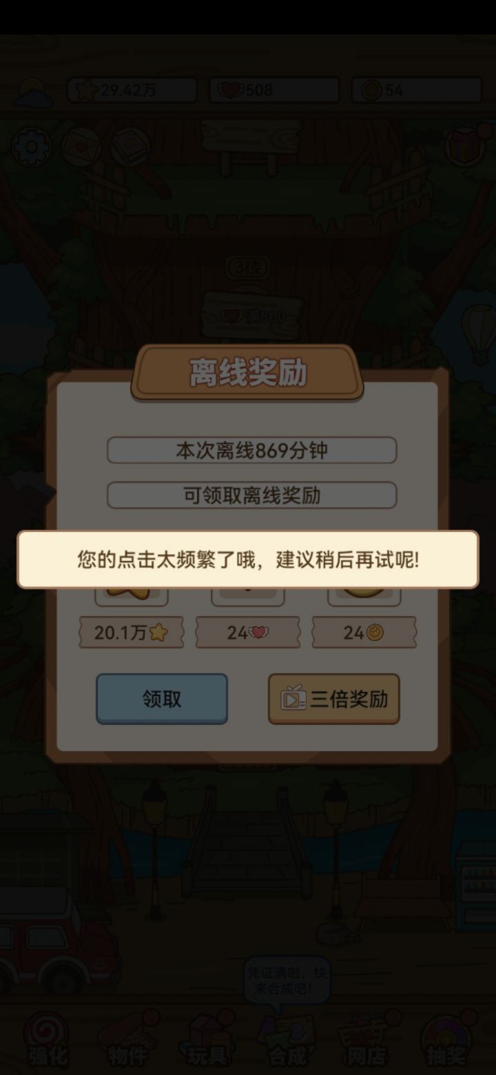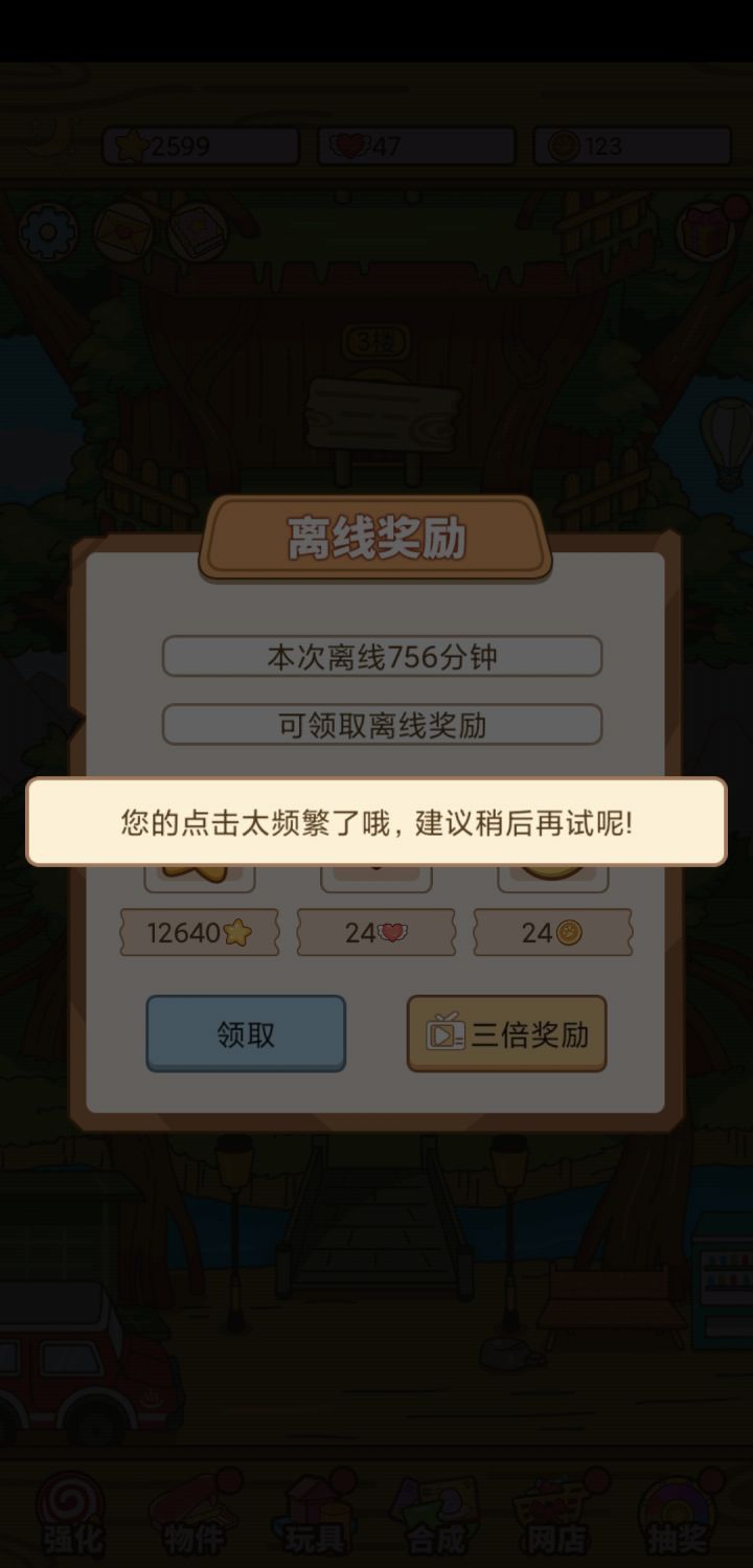 不知道是不是就我一个人这样,挂机收益,❤️多的时候(不是1个)想三倍领取,结果说我点击频繁,nm我就点了那一次。❤️只有1个的时候就可以看,咱也不知道是咋回事,不想给就不想给呗搞这一套吓唬谁呢,无语住了😅😅😅